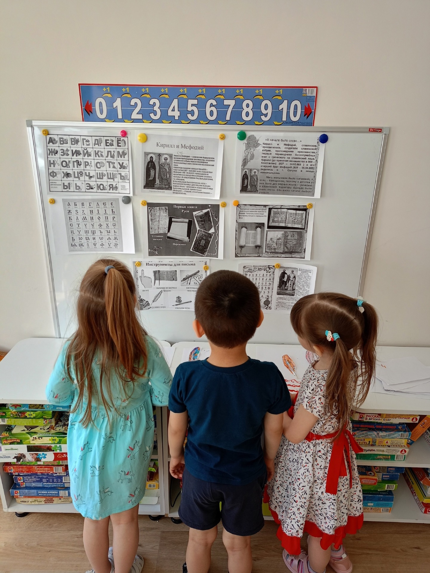 Этот праздник связан с именами святых равноапостольных братьев Кирилла и Мефодия — просветителей славян и создателей славянской азбуки. В ту пору книги писали от руки писцы, одну книгу писали несколько лет. Дети средней группы рассмотрели иллюстрации с изображением древних книг, сравнили с современными книгами. С появлением первых рукописных книг в XI веке многое изменилось. Книги стали писать на пергаменте, а переплёты делали из дерева и кожи.
