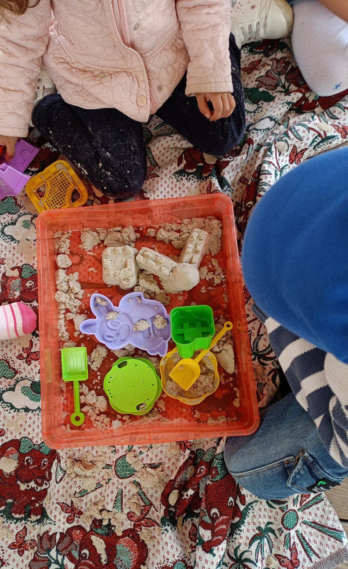 Ирая с кинетическим песком дети делали из него различные фигуры и даже целые скульптуры, развивая пространственное мышление и координацию движений.