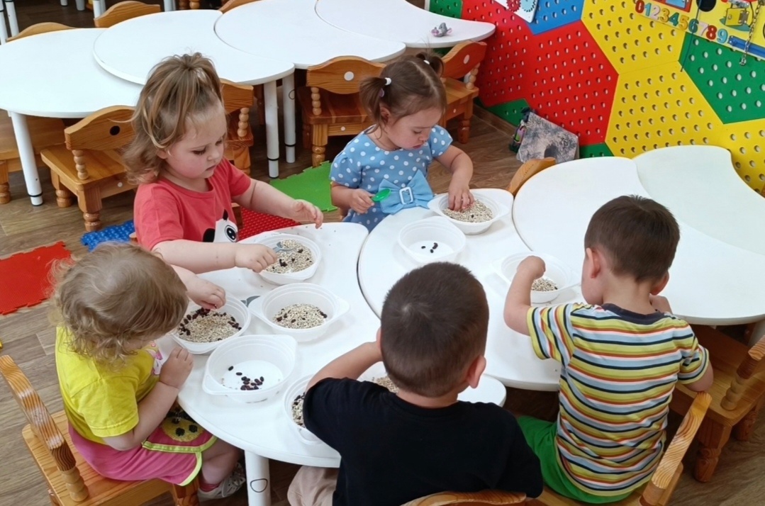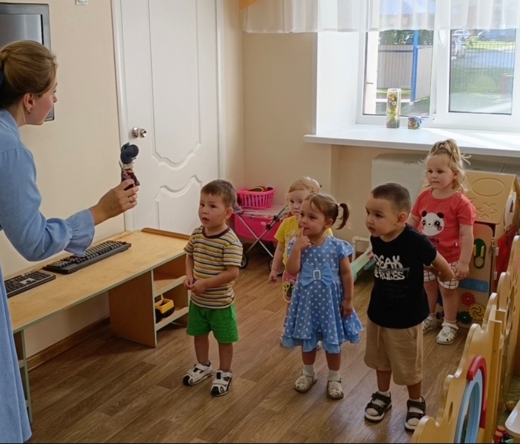 К детям первой младшей группы "Лучики" пришла мама мышка с просьбой о помощи найти её мышонка - он должен был перебирать зёрнышки у домика, но заигрался и далеко ушёл. Дети отправились на помощь мышке в лес под музыкальную физминутку: "Зашагали ножки".