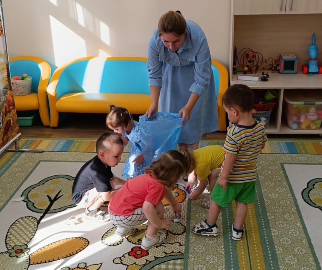 Оказавшись в лесу, дети обнаружили на полянке мусор. Отметив, что мусор наносит вред лесу и животным, приняли решение собрать его в мусорный пакет и отнести в мусорный бак. Дети собирали мусор необычным способом - с помощью игрушечных пинцетов.