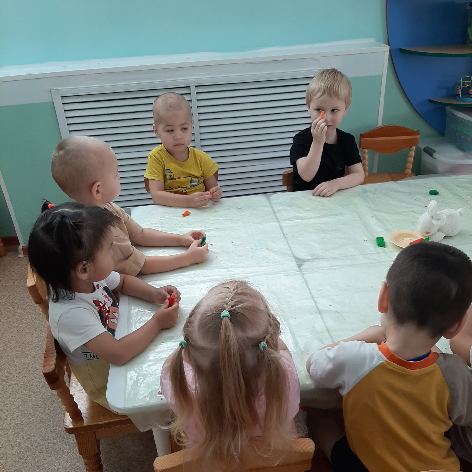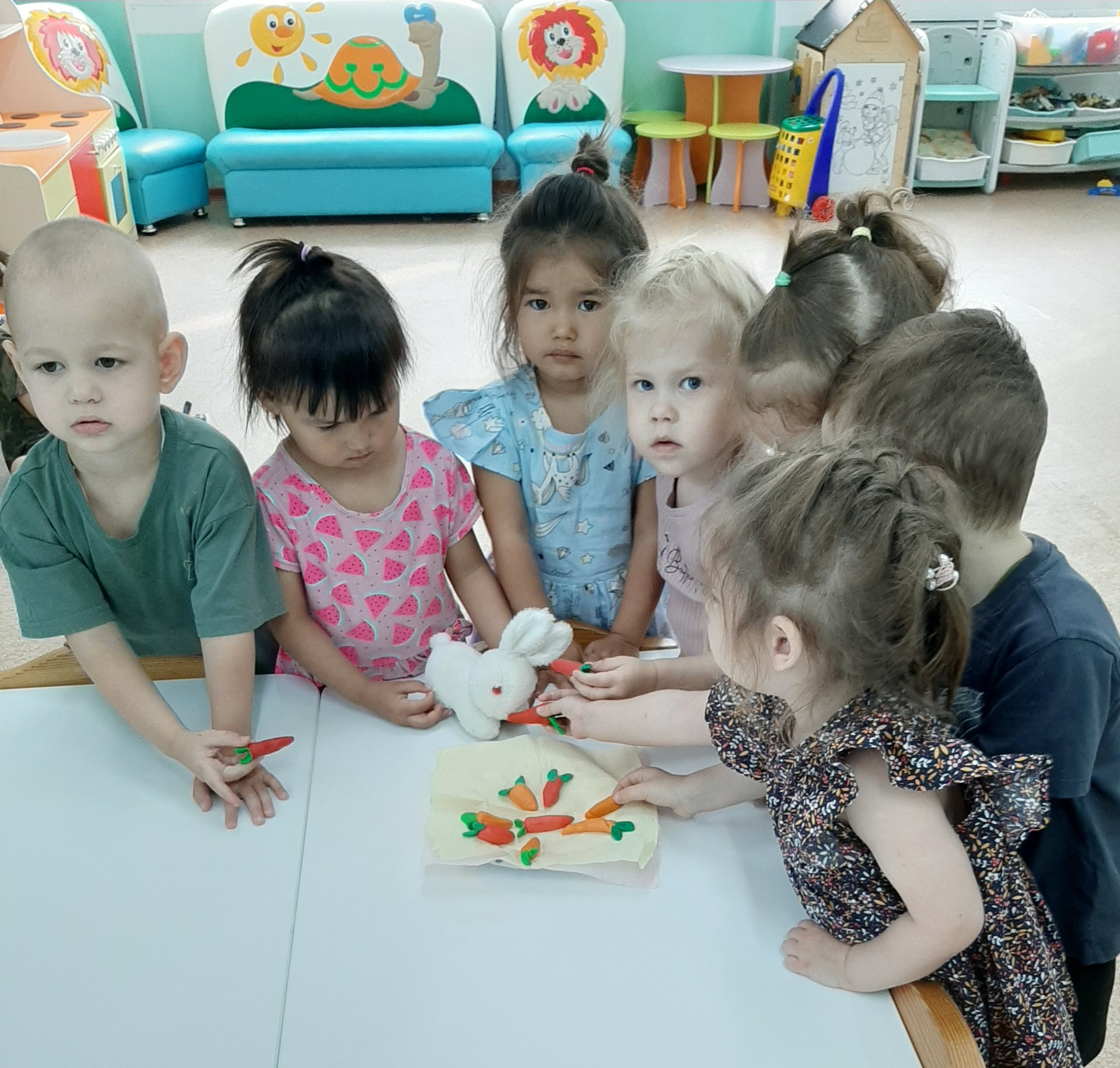 Любят изображать осень и ее дары и наши дошколята 2 младшей группы «Кораблик». Дети рисуют осенний урожай, листочки, грибочки, аппетитные дольки арбузов, лепят для зайчика морковку, делают осенние аппликации, поют про осень песни, играют в игры на осеннюю тематику. Дети отражают в работах свои впечатления от наблюдения за осенней природой, передают колорит осени: яркую разнообразную по цвету окраску листвы, листопад.