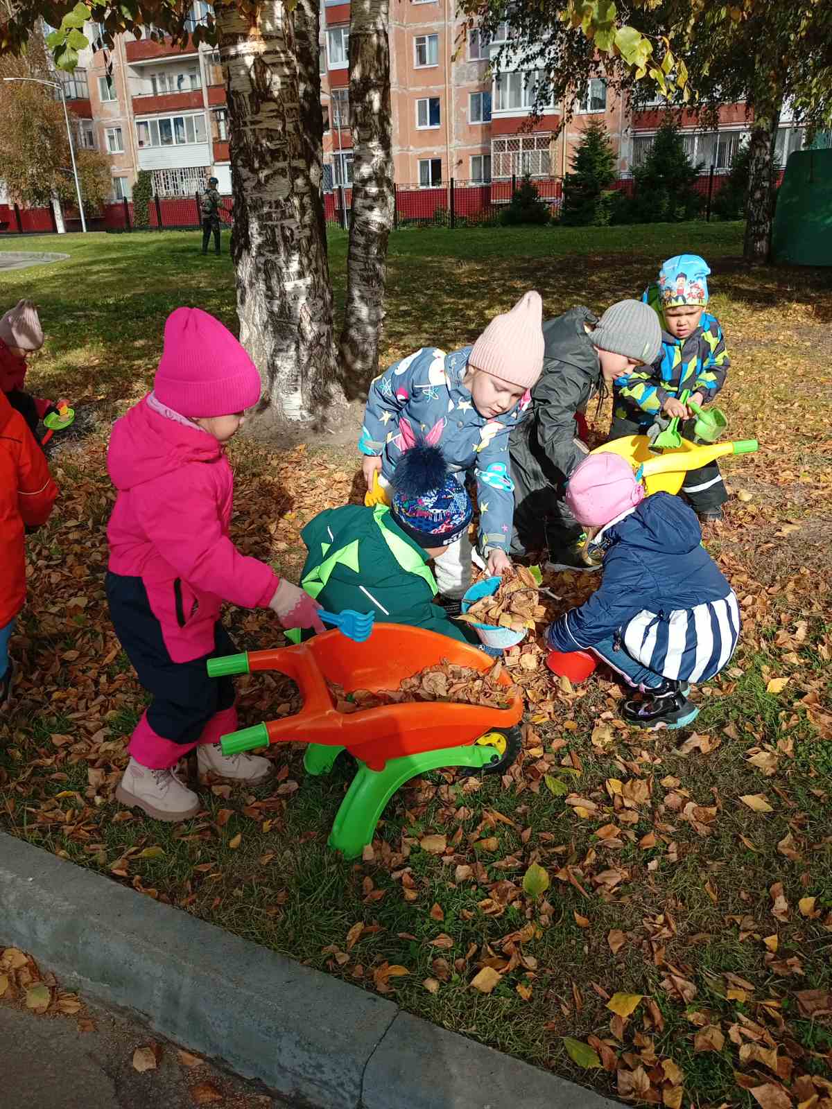 Например, мы с ребятами решили помочь помощнику воспитателя почистить участок территории детского сада от осенних листьев, навели порядок на своем участке, подмели веранду и домик, убрали осыпавшиеся ветки с березы и собрали сухие листья. Дети получили удовольствие от сделанной работы.