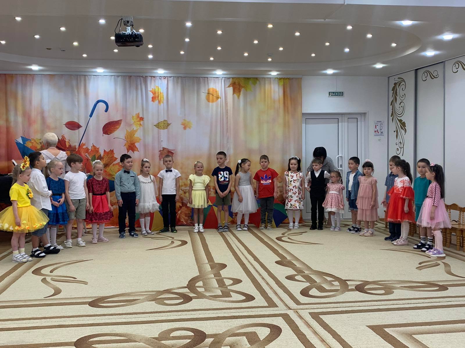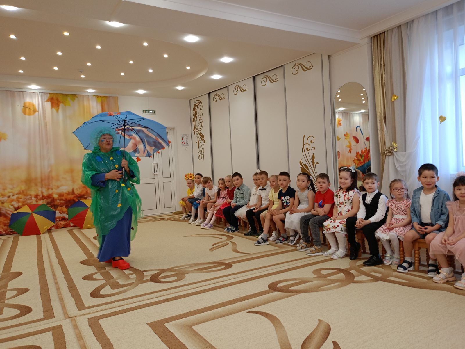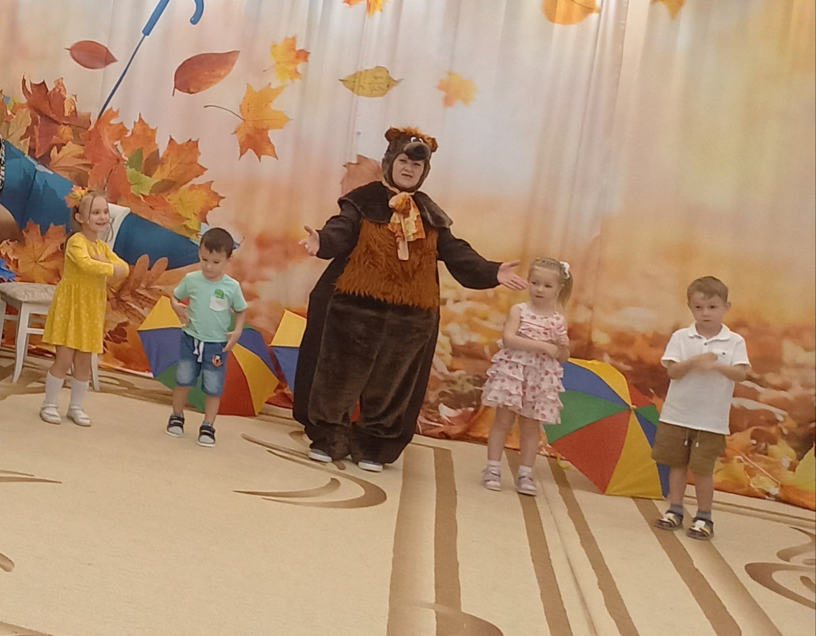 Праздник в детском саду — это всегда удивительные чудеса и волшебство. А осень считается самым волшебным временем года: буйство ярких красок, парад разноцветных листьев, изобилие овощей и фруктов. В это чудесное время в нашем детском саду традиционно проходят осенние праздники. Хоть и на дворе прохладно, а у нас в музыкальном зале царила теплая, доброжелательная атмосфера. В гости к ребятам младших и средних групп пожаловал Мишка – Топтыжка с большой корзиной осенних листочков и грибов. Он с удовольствием слушал песни малышей, водил с детьми хороводы и веселил их своими играми. Ребята рассказывали ему стихи и даже «прогулялись» с зонтиками под дождем. Самым ярким и запоминающимся эпизодом праздника у подготовишек стало появление Слякоти, которая обрызгала всех водой, проказничала и убеждала детей, что осень - грустная, мокрая без ярких красок, которые, кстати она не очень любит. Но дошкольники убедили её, что осень — красочное время года, когда можно радоваться шороху золотистых опавших листьев под ногами, дождику, под которым так интересно гулять под зонтиком, обув резиновые сапожки и надев дождевик. Весь утренник дети «доказывали» Слякоти, что осень - самое восхитительное время года! Выразительно читали стихи, эмоционально исполняли песни, задорно водили хороводы вместе с родителями, принимали активное участие в веселых играх. Музыкальный праздник получился веселым и ярким, подарил много позитивных эмоций и ребятам, и гостям!