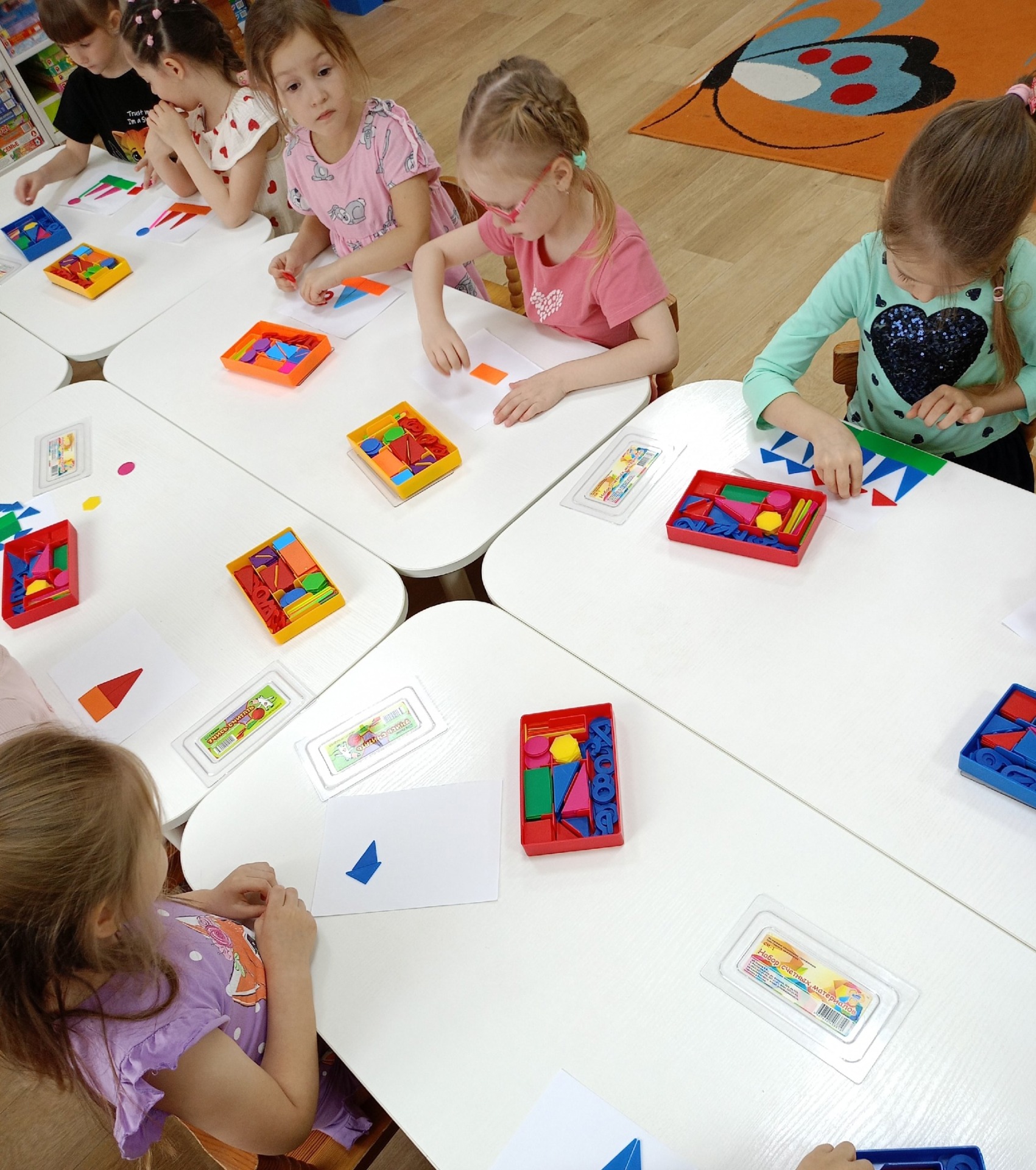 Образовательная деятельность по математике с использованием геометрических наборов в старшей группе «Конёк-Горбунок» детского сада. Дети с большим интересом и увлечением работали с наборами, которые включали различные геометрические фигуры: треугольники, квадраты, прямоугольники, круги.