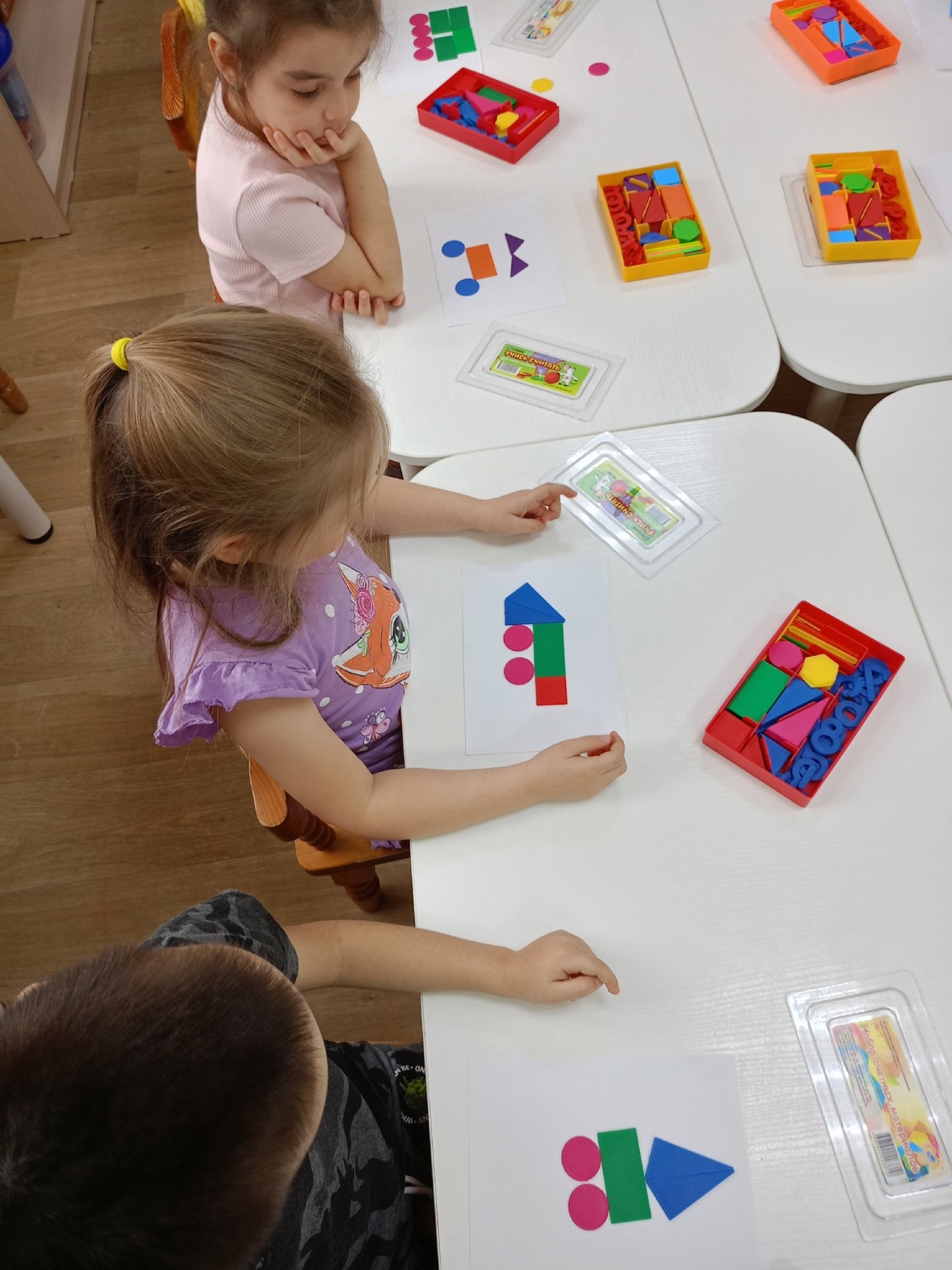 Дети собирали геометрические фигуры из частей, строили по образцу, а также составляли композиции из различных фигур.