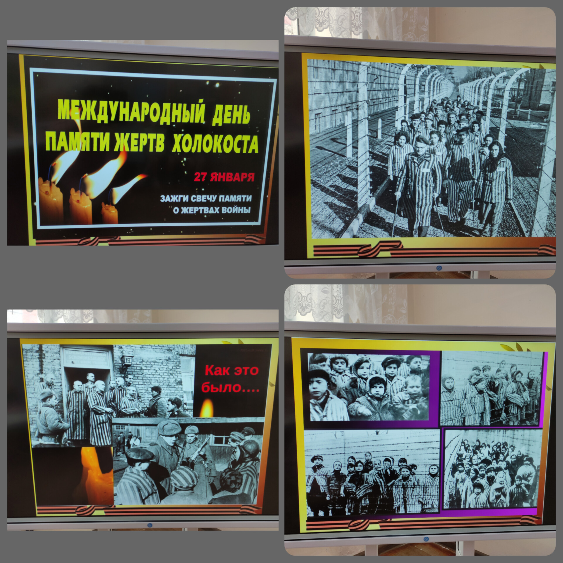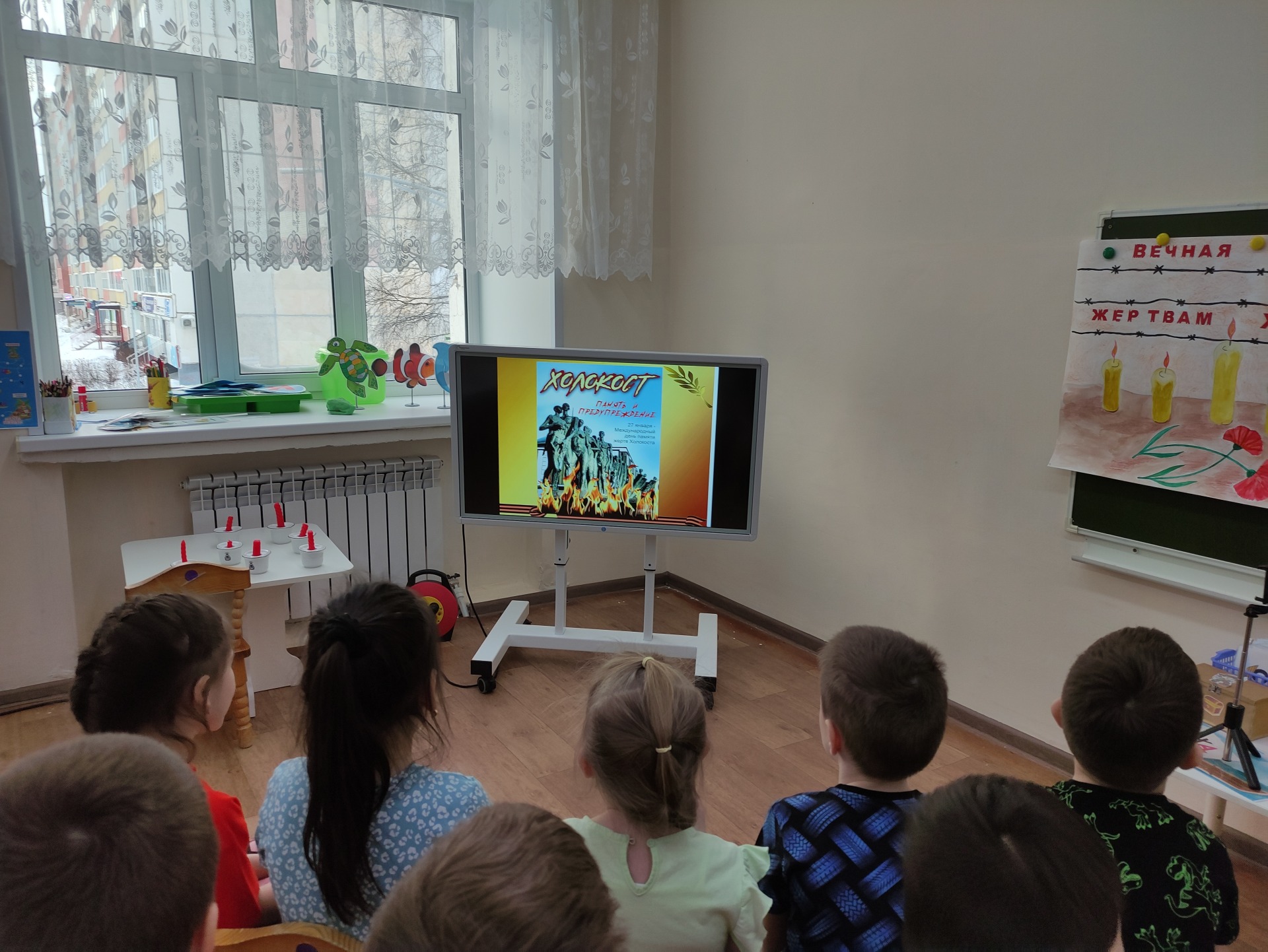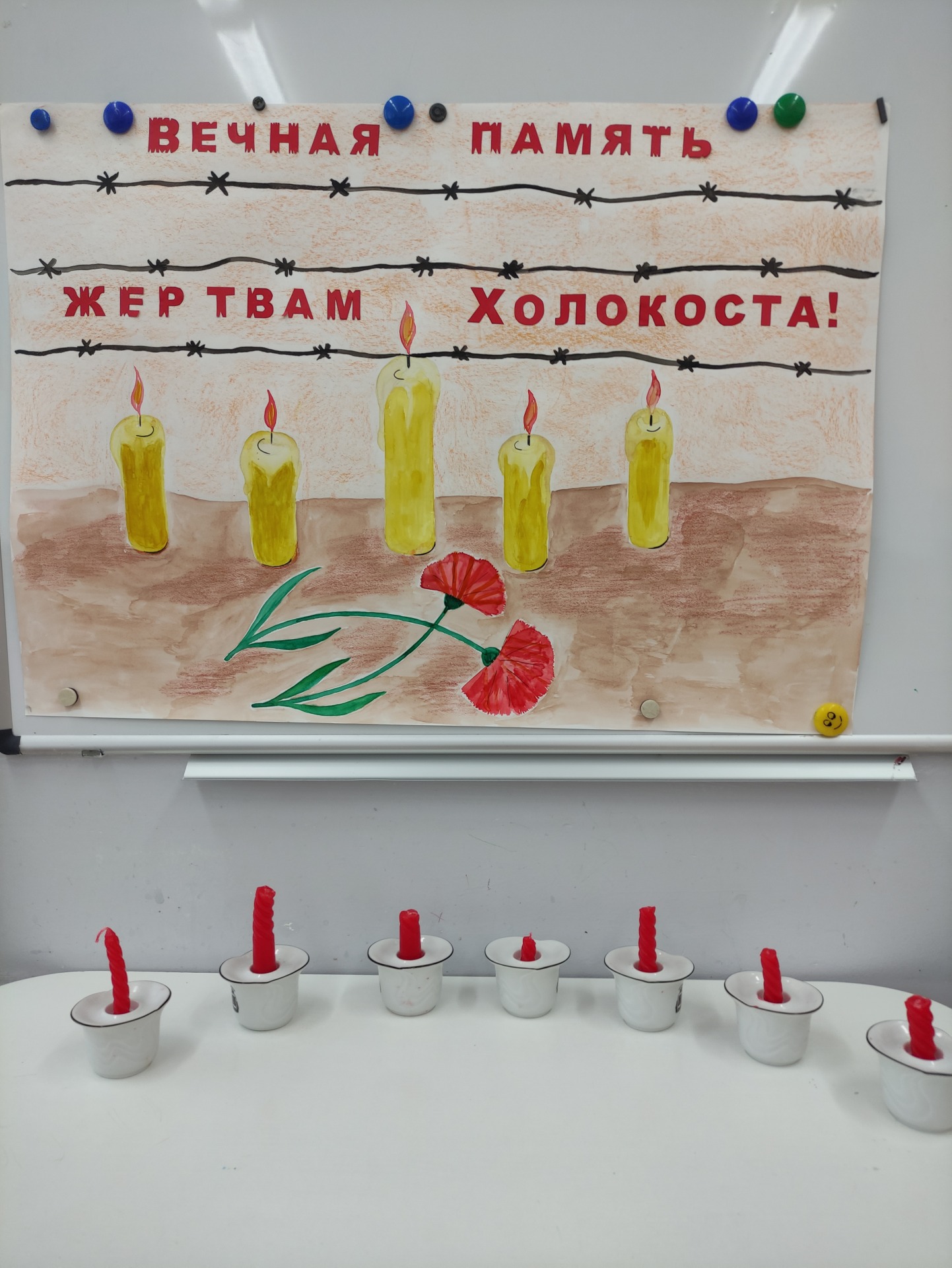 Ребята приняли участия в оформлении плаката «Вечная память жертвам Холокоста!» Мероприятие закончилось минутой молчания в память о жертвах Холокоста. Память об этой трагедии необходима, чтобы активировать добро, воспитывать и развивать в детях чувства толерантности и нести мысль о том, что именно от нас зависит мир на Земле! Мы помним о жертвах Холокоста! Сохранение памяти — залог того, чтобы подобные события никогда не повторились!