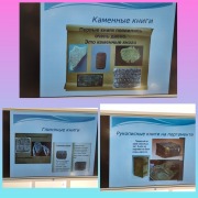 Попав в каменный век, дети узнали, что первой формой записи информации были каменные книги. Затем, отправившись в другое время, дети сами научились как можно передать информацию с помощью узелкового письма – кипу, как древние мексиканские индейцы. Далее пробовали, как древние египтяне, использовать растение - папирус и глиняные пластинки для записей. Было детям также интересно узнать, что пергамент изготавливали из кожи животных и для изготовления только одной книги требовалось целое стадо животных. Следующим пунктом нашего путешествия был Древний Китай, где дети потрудились над изготовлением страниц шелковой книги. Переместившись в Древнюю Русь дети пытались процарапать изображения на коре березы – бересте. И только потом, спустя многие годы появилась бумага и настоящий печатный станок. И еще, 11 марта отмечается день выхода первой печатной книги. С помощью опытно – экспериментальной деятельности дети выясняли удобно или нет было пользоваться и хранить глиняные, шелковые, берестяные книги. Ребята убедились в том, что книга вечна, и какой длинный путь она прошла. Она жива, живет, что каждая книга – это кусочек истории, величайшее сокровище человечества, кладезь мудрости и источник знаний.