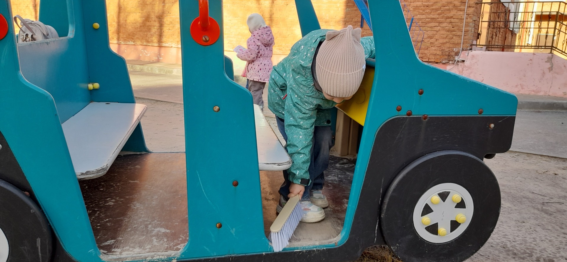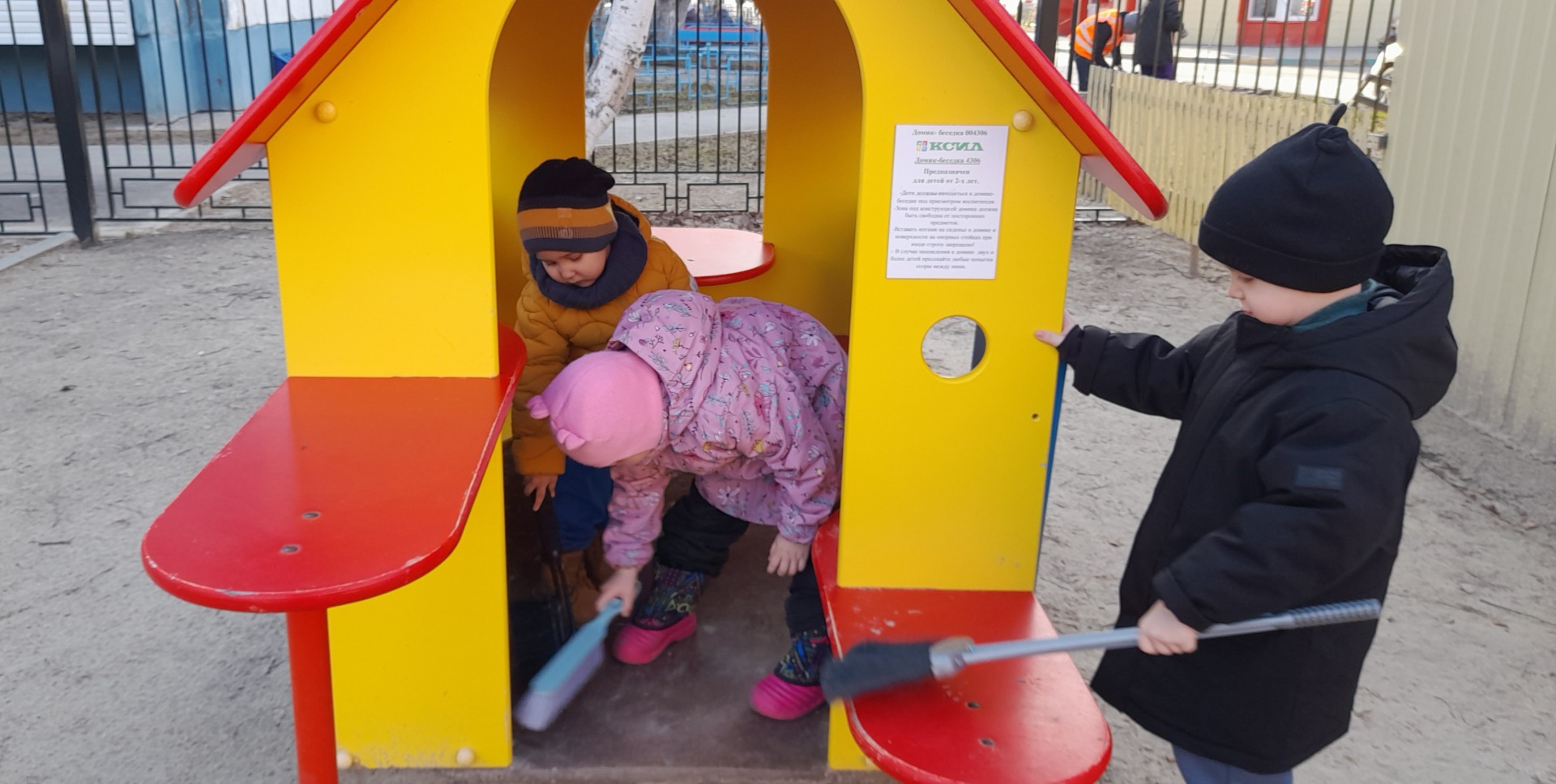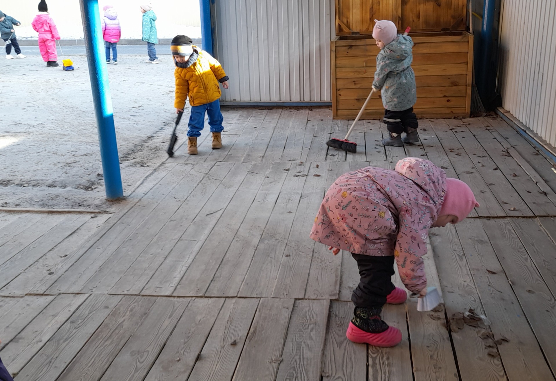 При наблюдении за работой дворника у воспитанников появилось огромное желание помочь, сделать что-то для детского сада, принести пользу окружающим и быть просто полезными. Девочки и мальчики быстро включились в работу, помогали собирать ветки, сухие листья, подметать мафы, веранду. Все были довольны проделанной работой.