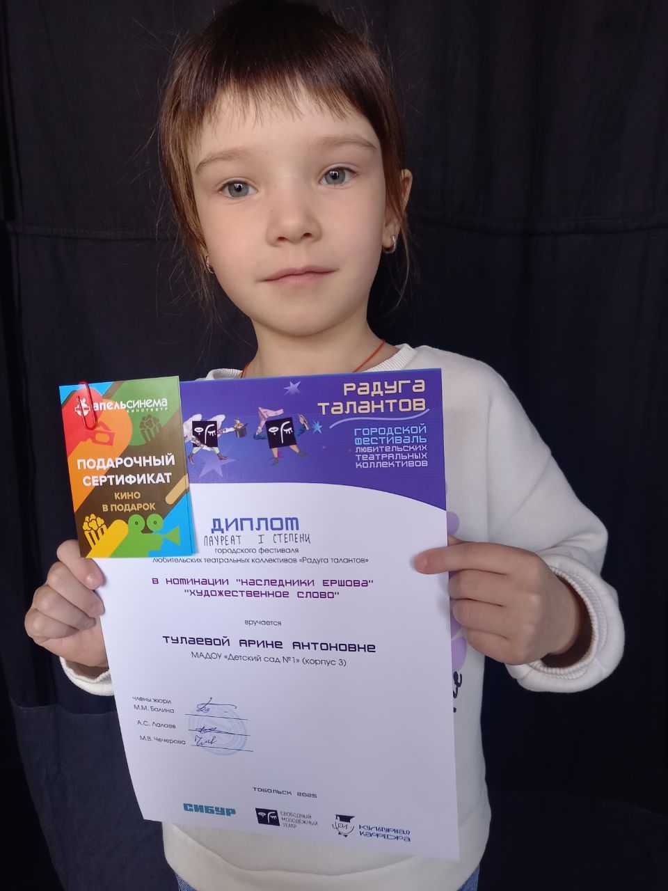 10-12 мая в нашем городе прошел Городской фестиваль любительских театральных коллективов «Радуга талантов». Организатором фестиваля является Свободный молодежный театр. Партнером выступил СИБУР. Участниками конкурсной программы были любительские детские, молодежные и взрослые коллективы в традиционных номинациях «Художественное слово» и «Спектакль». В этом году, объявленного годом П.П. Ершова в Тобольске, фестиваль украсила специальная номинация «Наследники Ершова» в которой участники представляли номера художественного слова и спектакли по детским произведениям современных тобольских авторов. Наш детский сад на фестивале в этой номинации достойно представила наша маленькая звездочка Арина Тулаева – воспитанница подготовительной группы «Сказка». Её выступление со стихотворением «Сказочный сон», написанный по мотивам произведения Петра Ершова, талантливым педагогом Рябиковой Насимой Фаридовной было высоко оценено членами жюри. Арина получила Дипломом Лауреата I степени. От всей души поздравляем наше юное дарование! Мы очень гордимся ею!