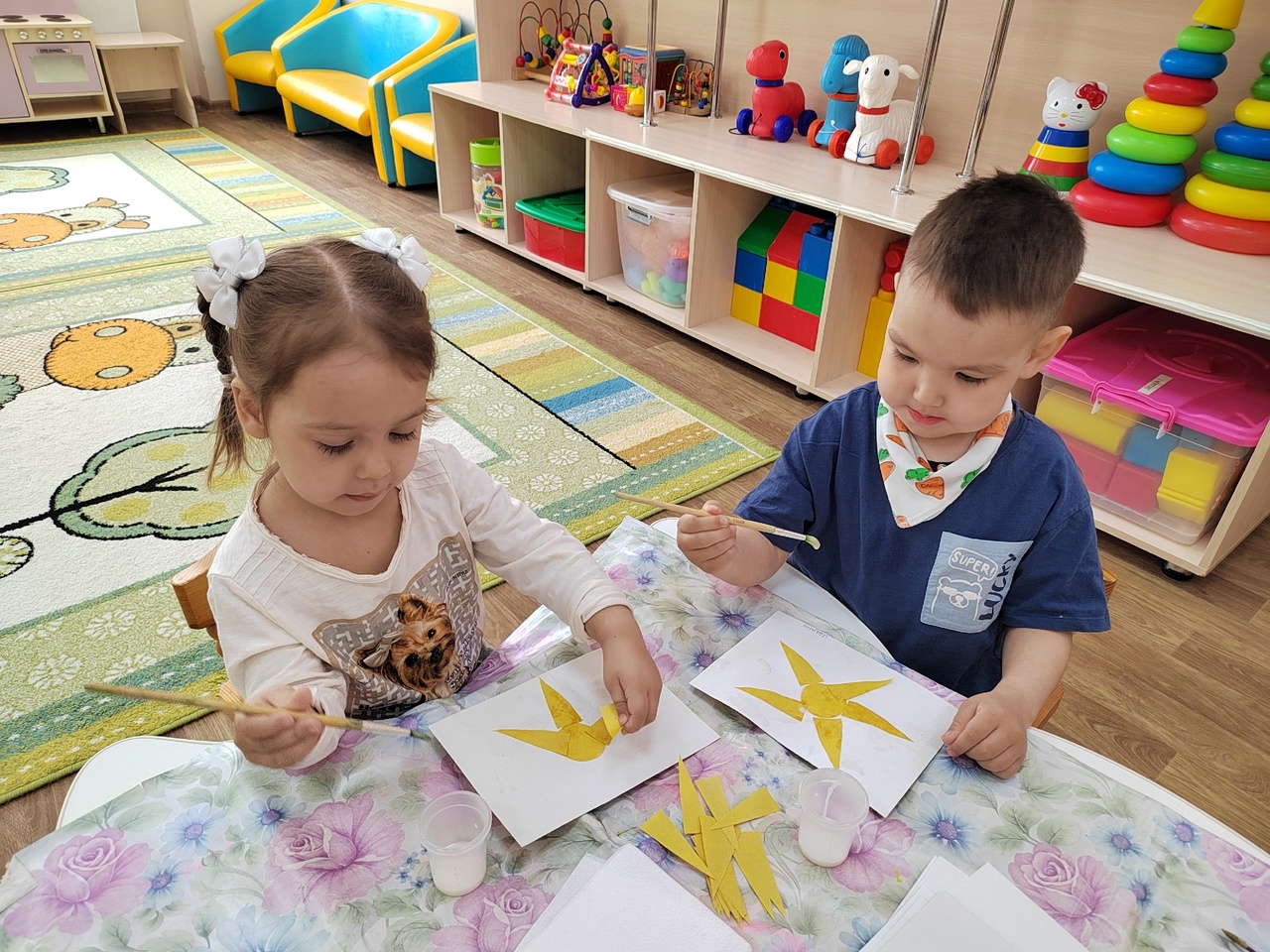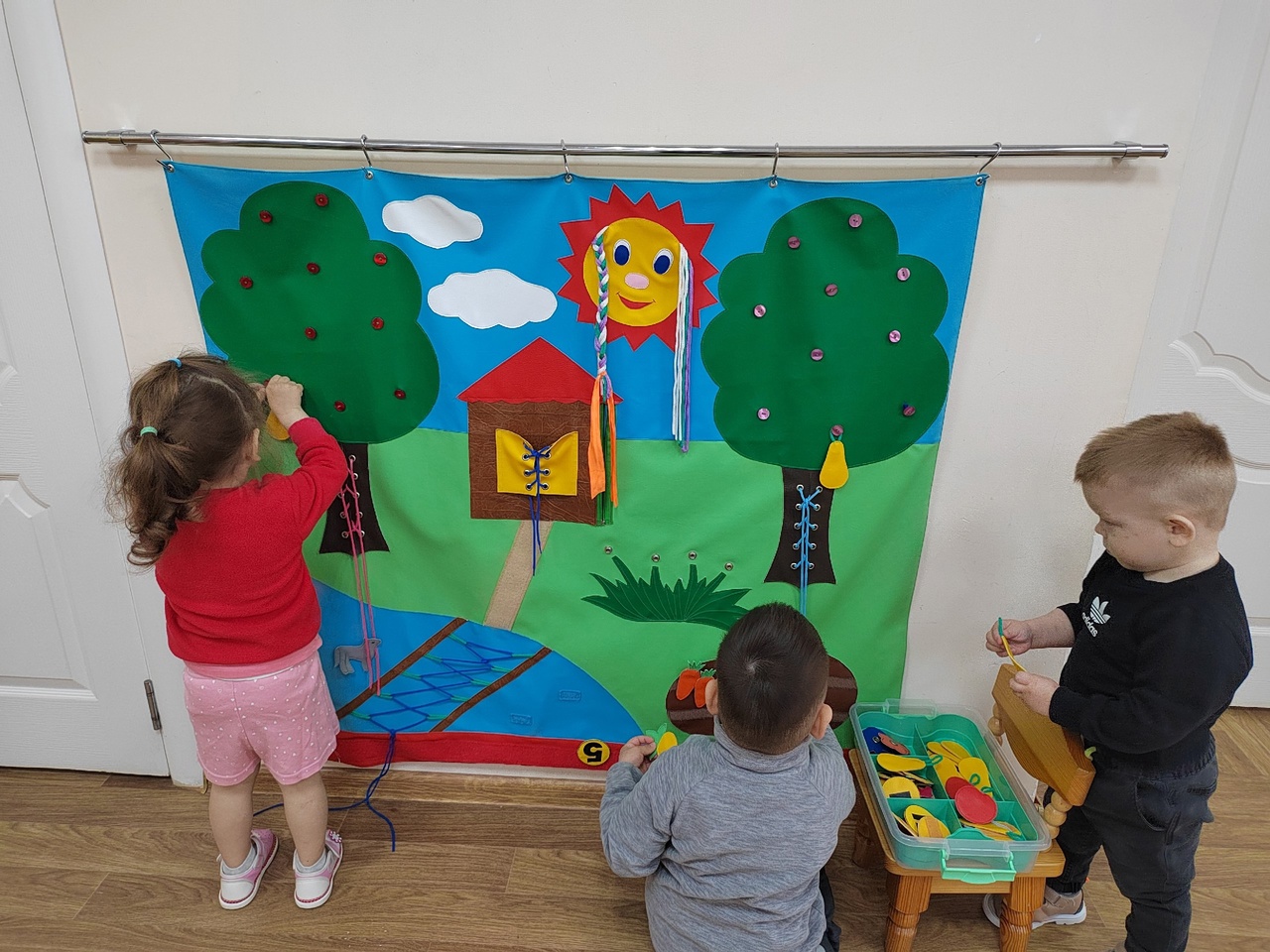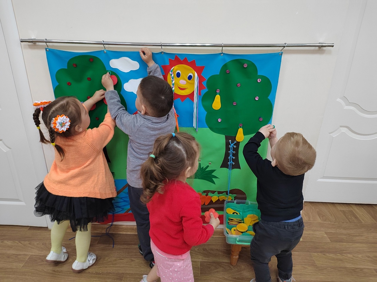 Дети первой младшей группы "Топотушки" расширяли представление о солнце как источнике света и тепла, знакомились с его значением для природы и человека. Ребята играли с яркими, жёлтыми предметами, имитирующее солнце (шары, мячи), лепили, рисовали солнышко, делали аппликацию - Лучики для солнца. На прогулке наблюдали за солнце, облаками, ежедневно определяли погоду "солнечно" или "пасмурно". Слушали стихотворения и песни о солнце. Так же использовали одни из интересных наполнений нашей группы, это многофункциональный дидактический коврик, где мы закрепили, что при свете солнца и труда людей выращивается урожай и игровые панели в нашей группе. Автор заметки: воспитатель Кузнецова А.И.