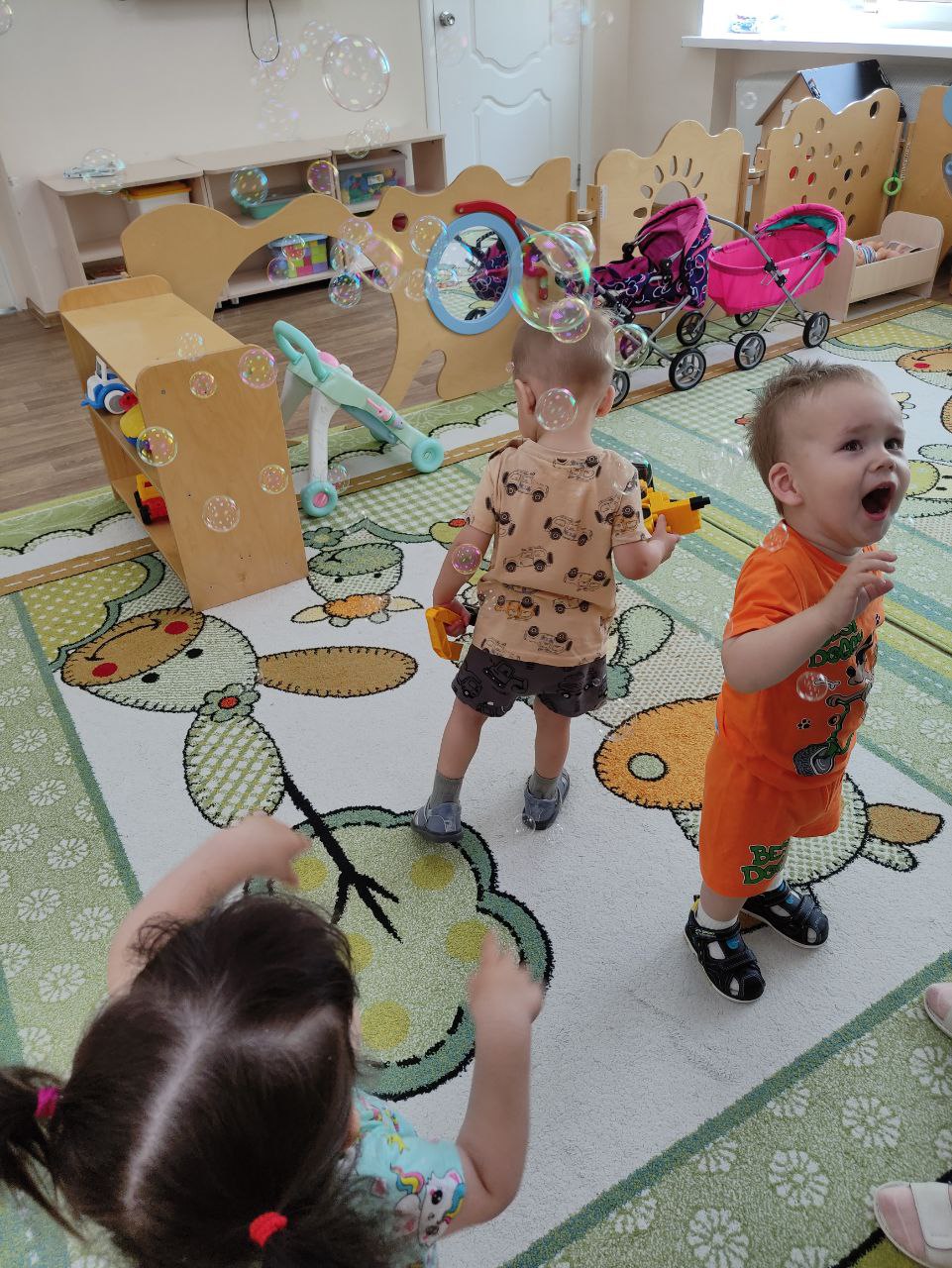 Конечно же, с нашими малышами из группы «Топотушки» мы часто используем эту забаву, им она очень нравятся. Сегодня в гости к детям пришла Фея мыльных пузырей и принесла с собой разные флакончики с жидкостью для выдувания пузырей. Ветерок помогал Фее выдувать и отправлять в путешествие разноцветные шарики, а ребята веселились, ловили мыльные пузыри и с восторгом наблюдали за разноцветными пузырьками, за их волшебными превращениями. Дети смеялись, прыгали от радости, визжали от восторга, хлопали в ладоши, ловили пузырьки. С огромной радостью малыши попытались сами попускать мыльные пузыри. Они получались воздушными, радужными, маленькими и большими. Чтобы день пускания мыльных пузырей остался в нашей памяти, мы с детьми поиграли в игры – эксперименты: «Пенка на ладошках» - ладушки, ладушки с мылом моем лапушки, «Поймай пузыри!», «Сделай пену» и ещё решили и нарисовать мыльные пузыри с помощью обычных пробок и красок. У нас получились отличные картины. Ребята были очень довольны и счастливы. Ведь мыльные пузыри для малышей – это волшебство!