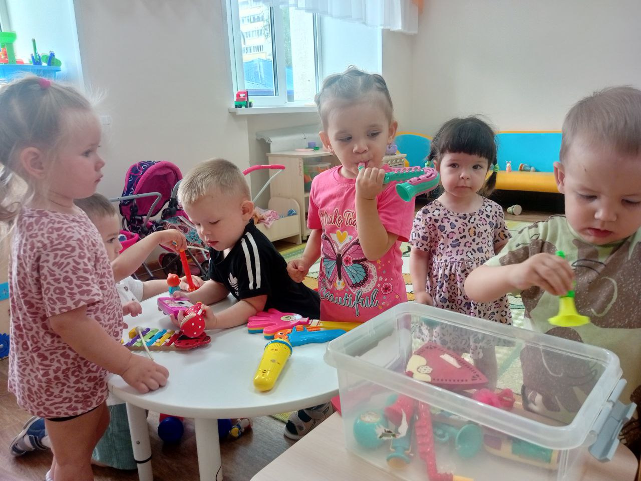 Мы как воспитатели стремимся в нашей работе облегчить адаптацию детям и подбирать разные игры, которые будут способствовать положительному настрою ребенка и увлекать его. Все игры, адаптированные к возрасту ребенка, включают элементы, способствующие снятию напряжения и переключению внимания. На прогулке мы проводим игры с песком и водой, игры с мячом и постройка башен из кубиков. В группе ребята знакомятся с музыкальными инструментами, играют на них, катают машинки, играют с пирамидками, юлой, катают кукол в колясках, кормят их и варят им обед.