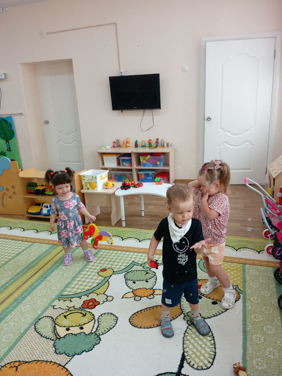 И очень важно чтобы с самого утра в группе была доброжелательная атмосфера, а для этого мы включаем детские песни из мультфильмов и пускаем мыльные пузыри, ребята любят двигаться под музыку и лопать пузыри.