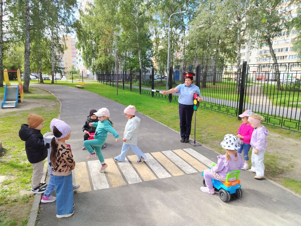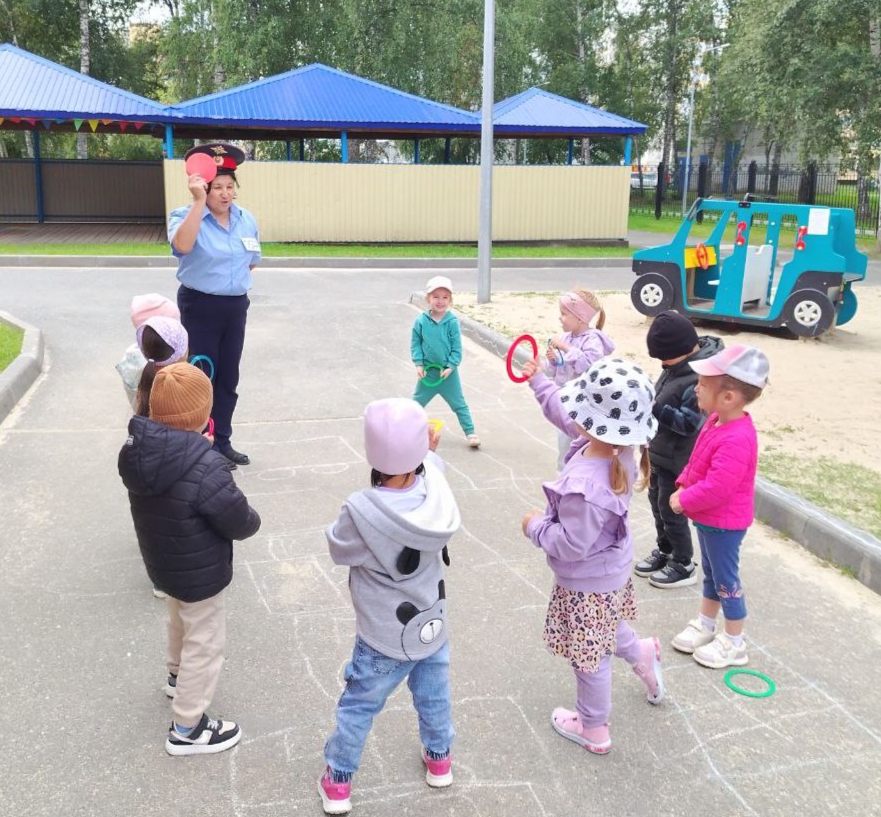 На прогулке, в гости к детям пришел сотрудник ГИБДД и провел интересные и познавательные беседу и игры, раскрывающие смысл красного, желтого и зеленого сигналов. Дети познакомились с соответствующими знаками и научились правильно реагировать на сигналы светофора.