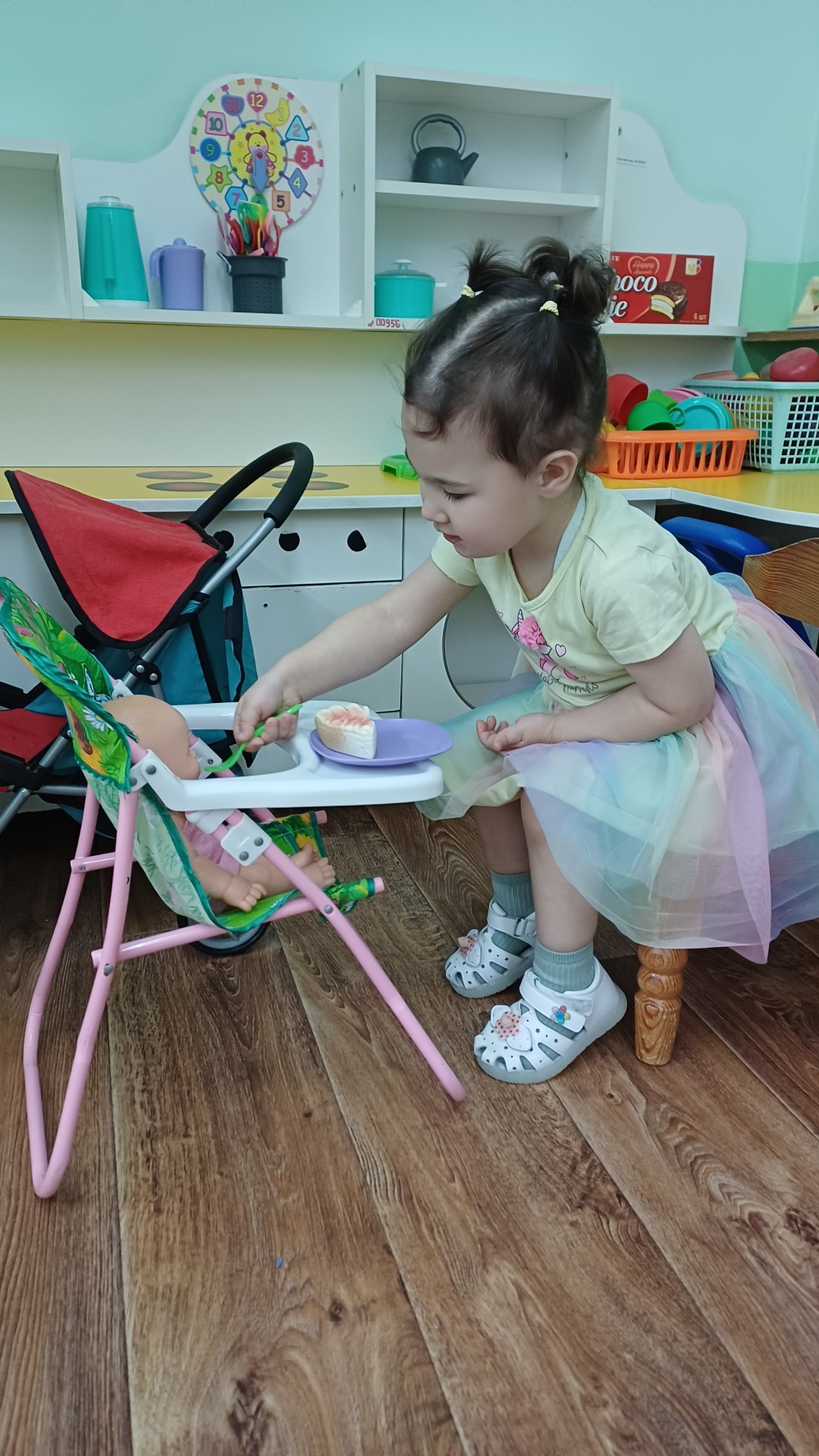 Провели дидактические игры: «Назови ласково», «Очень мамочку люблю, потому что…..», «Животные и их детеныши», «Как зовут твою маму?». Создавали условия для организации сюжетно-ролевых игр: «Семья», «Дочки-матери», «Мама в магазине».