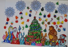 Дети учились создавать фигурки в техника папье-маше символ наступающего года, забавных снеговиков, колокольчики и шары. Это кропотливый, но очень увлекательный процесс: бумага, клей, долгая сушка, а потом — самый интересный этап — роспись. Каждая такая игрушка получается уникальной, хранящей отпечатки маленьких пальчиков и бездну фантазии. Игрушками из папье-маше дети украсили Новогодний плакат.