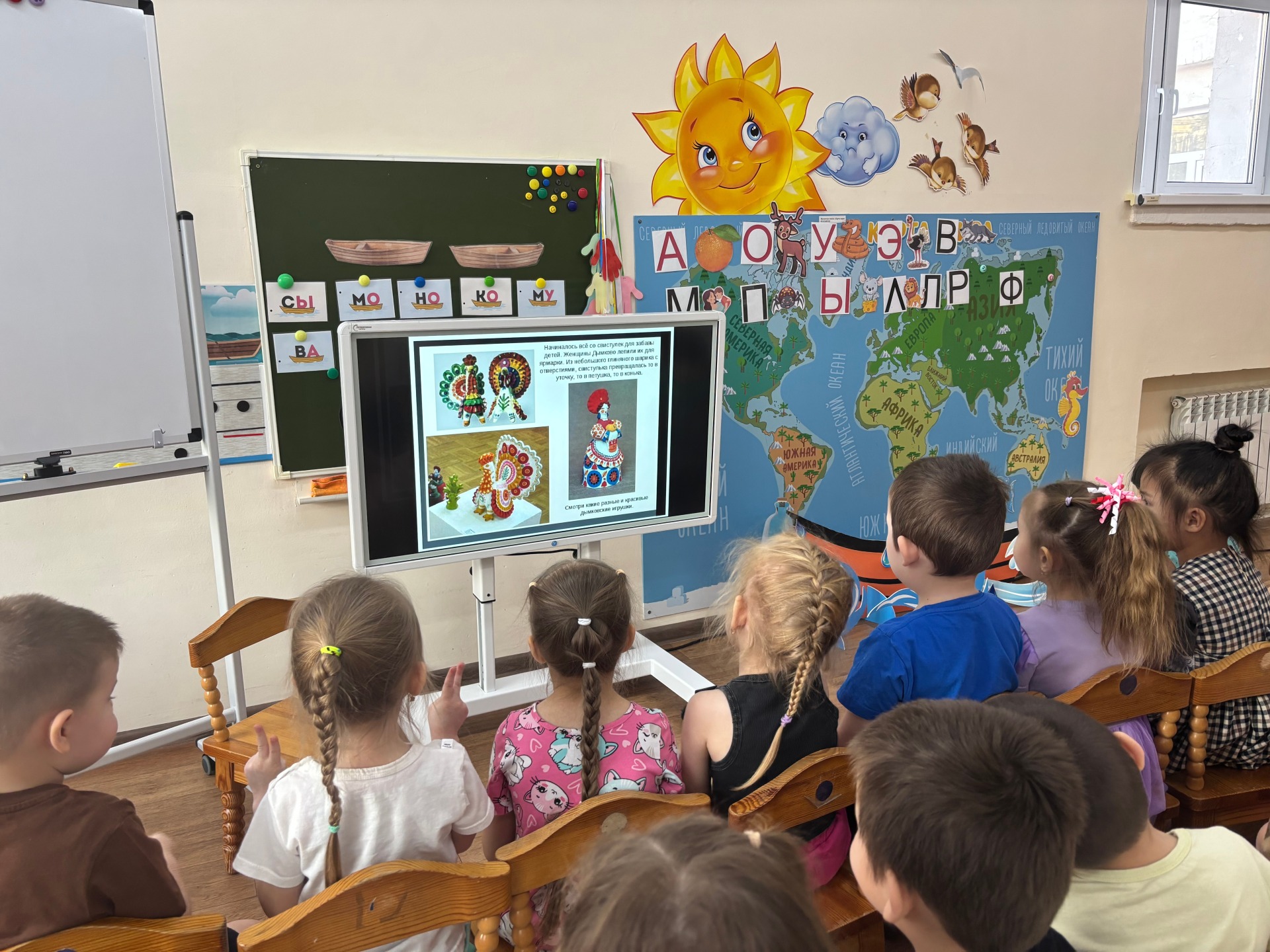 Дымковская игрушка – один из русских народных, глиняных художественных промыслов. Возник он в заречной слободе Дымково, вблизи города Вятки (ныне город Киров). В давние времена жители этой слободы, целыми семьями лепили глиняную игрушку. Месили глину, лепили, сушили и обжигали, получившиеся фигурки. Зимы там холодные и суровые. Люди постоянно топили печи, но не только от мороза, но и для обжига игрушек. Вся слобода стояла в дыму. Дым от печей, да туман в пасмурные дни, вероятно дали название поселению - Дымково, а игрушки стали называть дымковскими. Вот так я начала знакомить детей группы «Сказка» с историей слободы и возникновением глиняных игрушек.