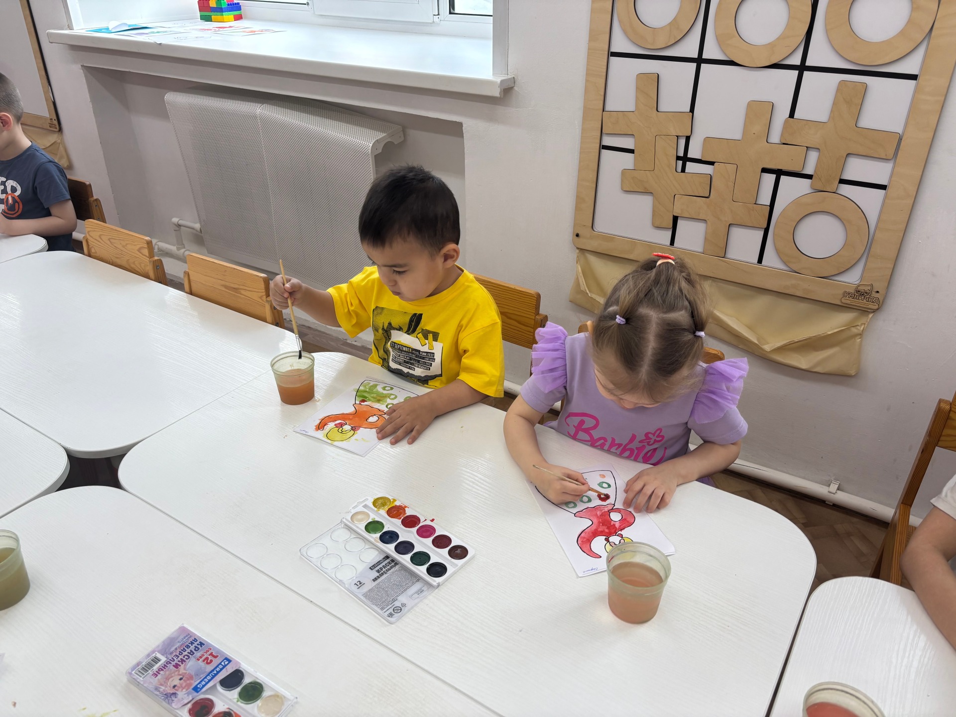 Дети рассмотрели глиняные игрушки, с помощью презентации «Дымковская игрушка» послушали историю их создания, узнали о характерных особенностях росписи игрушек. Вместе с детьми мы рассмотрели и выделили элементы геометрического узора дымковской росписи (круги, прямые и волнистые линии, клетка, точки-горошины). После моего показа приёмов изображения элементов, дети перевоплотились в художников и самостоятельно расписывали дымковскими узорами силуэты-шаблоны игрушек с помощью яркой гуаши. Несмотря на то, что в рисунках детей использовались одни и те же элементы росписи, все работы получились разные, с индивидуальными особенностями. Посмотрите, вот такие барышни и лошадки получились у детей.