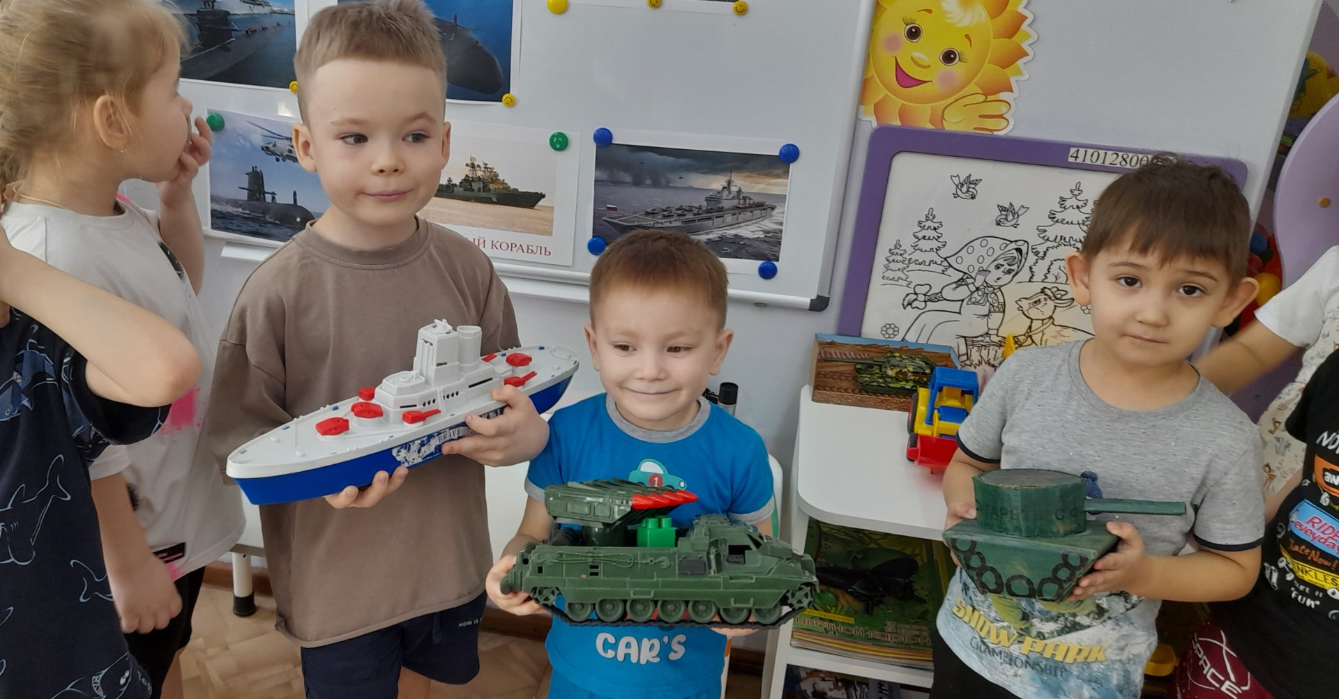 А ещё мы были в гостях у ребят группы ,, Сказка" и с удовольствием посмотрели выставку военной техники, отменили, что есть военный корабль который называется линкор. Заметку подготовила воспитатель Рыбьякова Н.А.