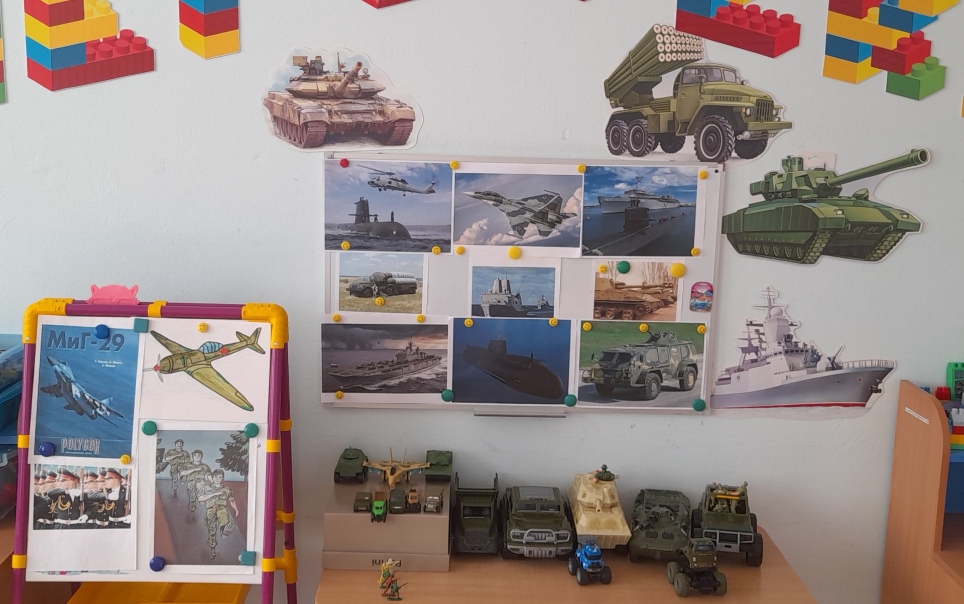 Любая техника, а особенно военная привлекает внимание детей. Она вызывает у них интерес и побуждает желание изобразить не очень сложную модель. Ребята нарисовали: танки, бронетранспортёры, машины и подводные лодки. Рисунками мы украсили раздевалку.