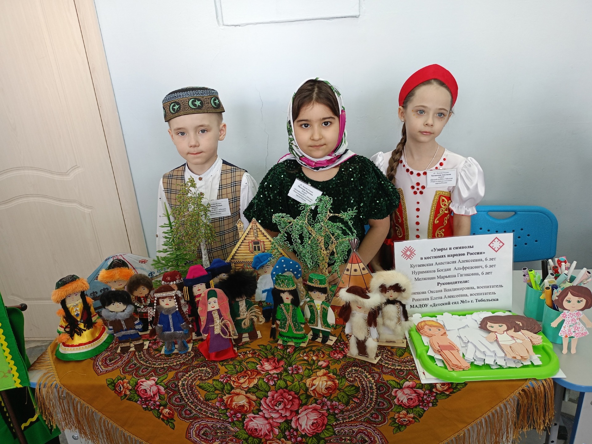 Воспитанники подготовительных групп «Конёк-Горбунок» и «Гномы» приняли участие в городской выставке с проектом «Узоры и символы в костюмах народов России».