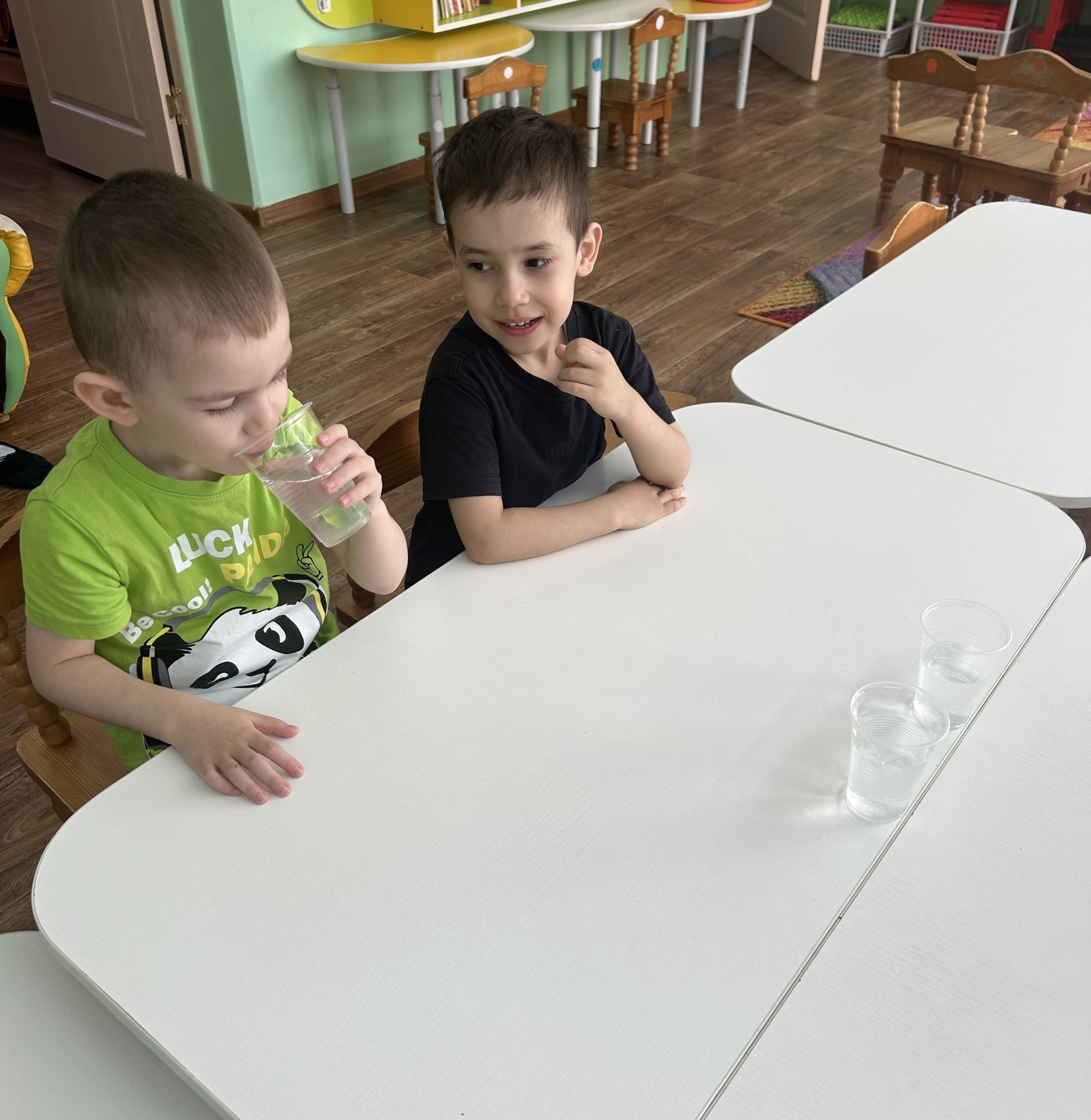 Воспитанники узнали что наша жизнь не возможна без воды,она занимает важное место в жизни людей,животных и растений.На занятий дети определили,что вода без запах,без вкуса,прозрачная.Когда добавили соль,сахар,лимон вода осталась прозрачной,но появился вкус-соленая,сладкая,кислая.Дети с удовольствием продегустировали воду в своих стаканчиках и сделали вывод-вода может растворять сахар,соль и приобретать их вкус,оставаясь прозрачной.Но когда добавили гуашь на кисточке,вода окрасилась и стала цвета краски,дети сделали вывод-вода может терять свою бесцветность и прозрачность.