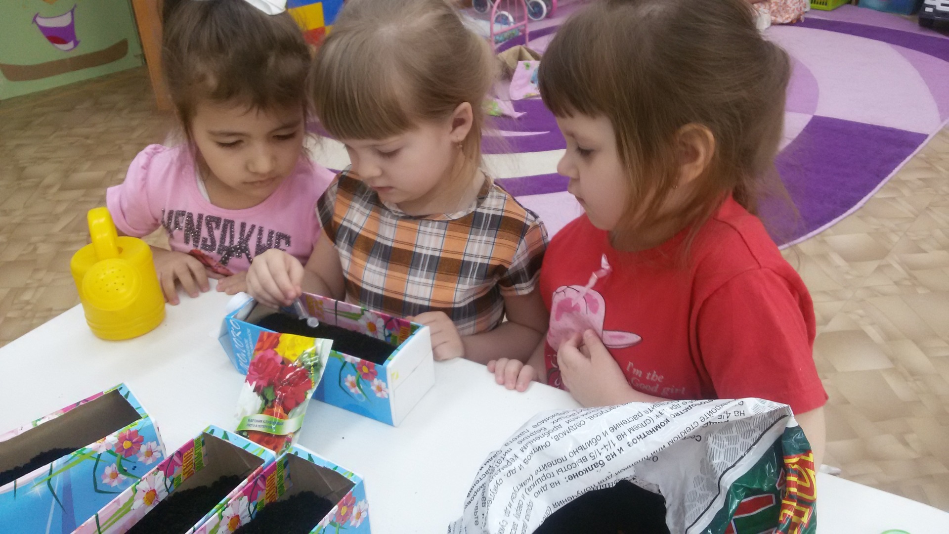 Принесли в группу семена бегонии и землю. Насыпали в коробочки, полили водой и посадили семена чудо цветка.