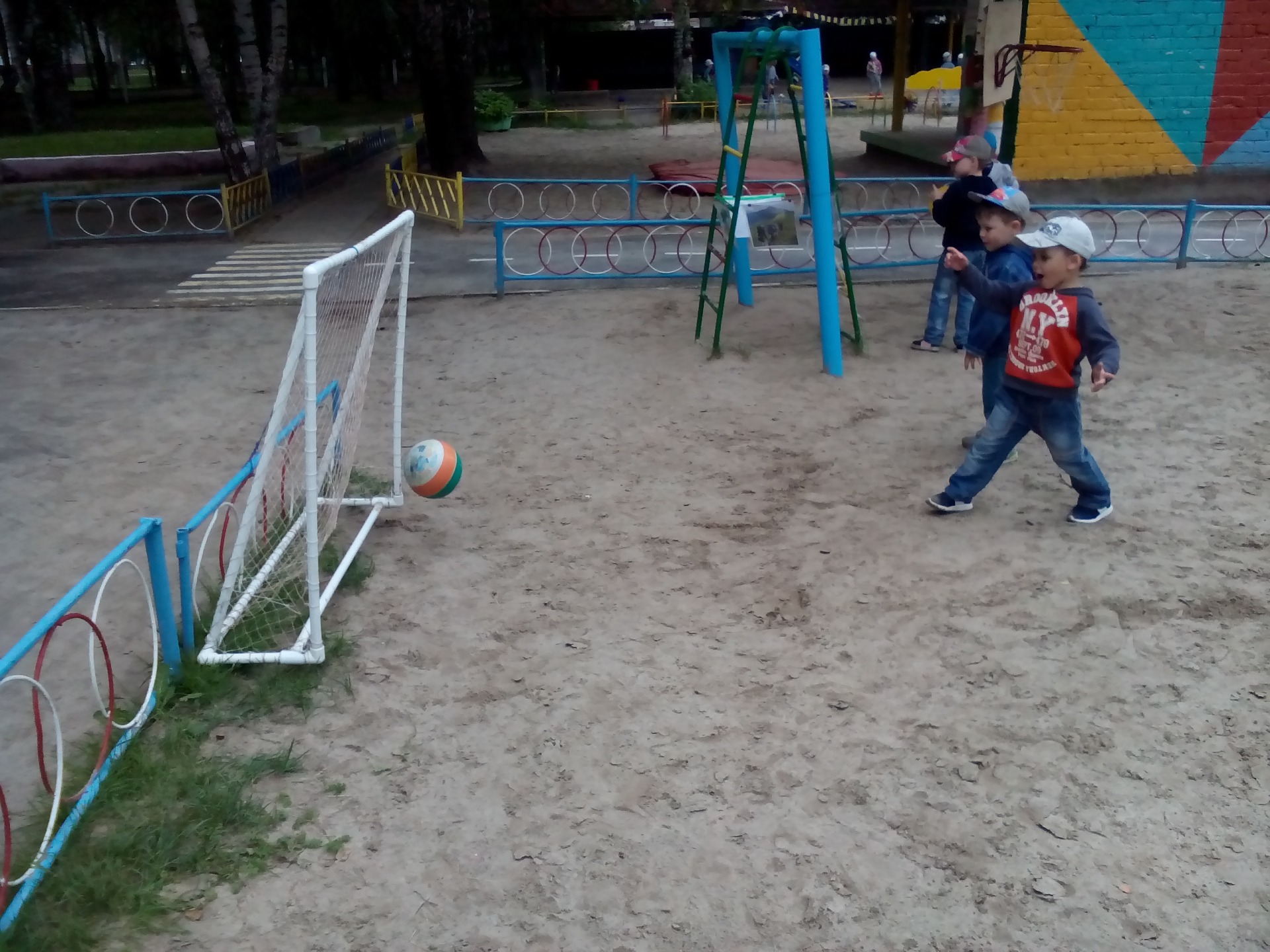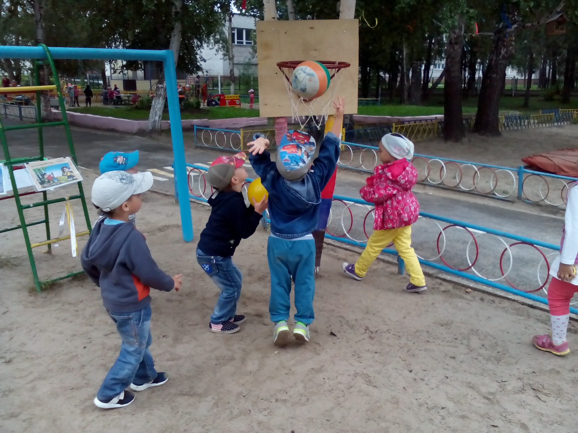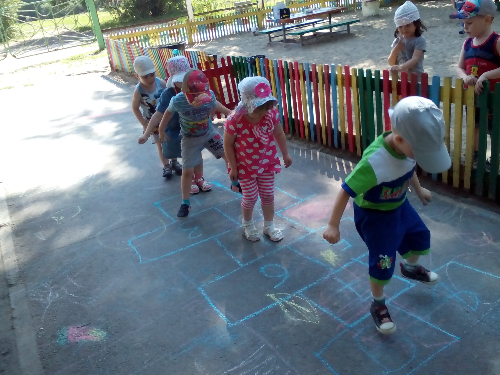 На участке группы дети с удовольствием приобщаются к элементам спорта (футбол, баскетбол) и народной дворовой игре «Классики».