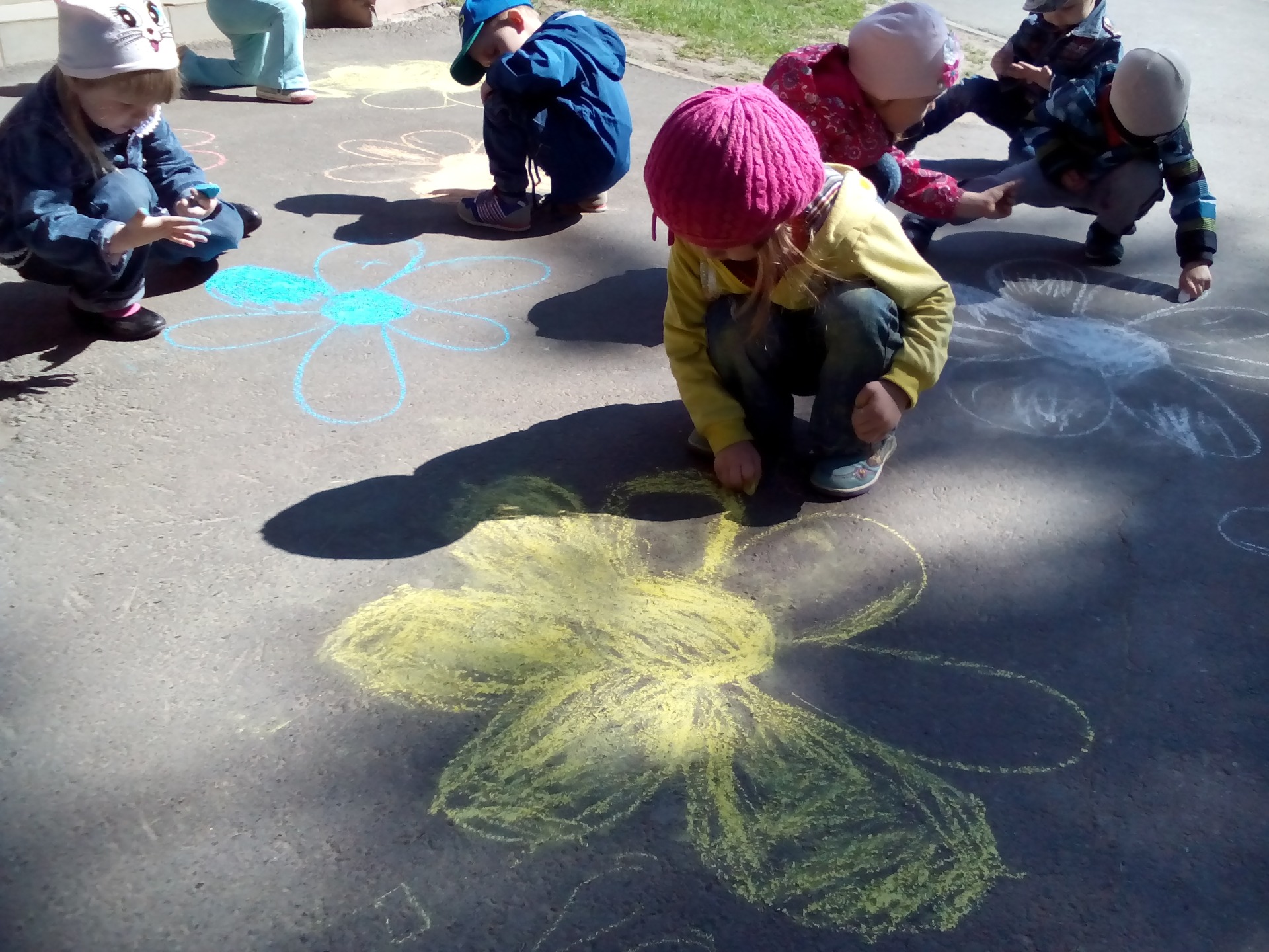 Детям предлагается разнообразная творческая деятельность. На прогулке мы рисуем мелом на асфальте, красками и карандашами.