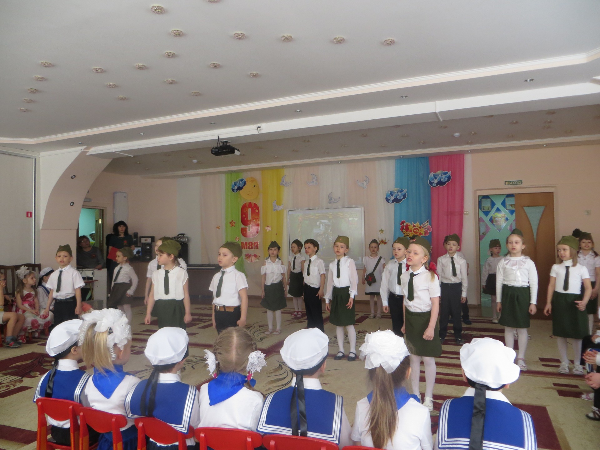Празднование дня Победы в детском саду не может пройти незамеченным, и традиционно начинается со «Смотра строя и песни», который проходит среди дошкольников старшего возраста. Воспитанники в военной форме десантников, моряков, пехотинцев проходят строем под военную музыку, показывая свое мастерство в умении ходить колонной, перестраиваться в две шеренги, маршировать под песню военной тематики. Каждая группа готовит стихи и танцы, исполняются песни военных лет: «Катюша», «Яблочко» и другие.
