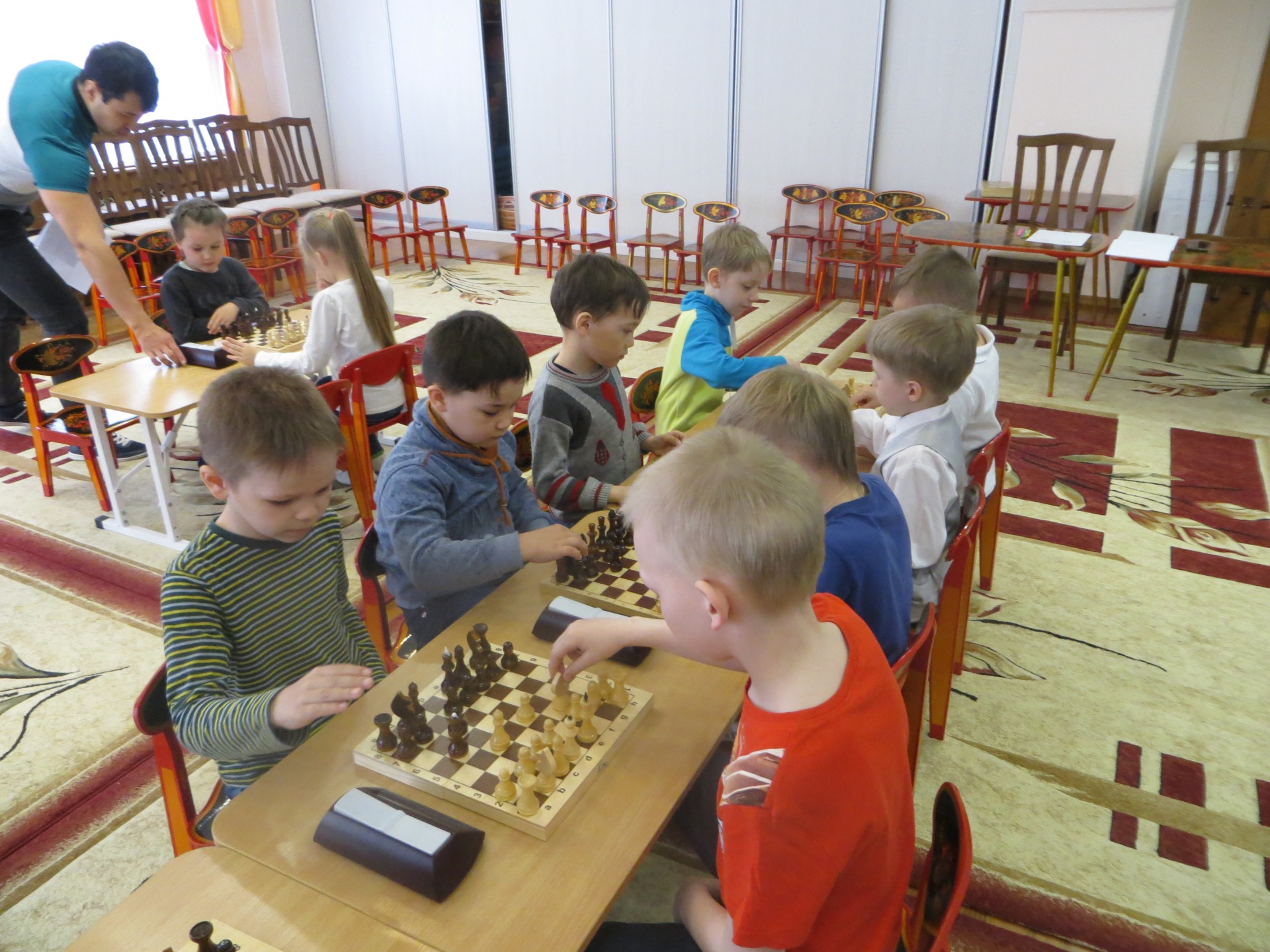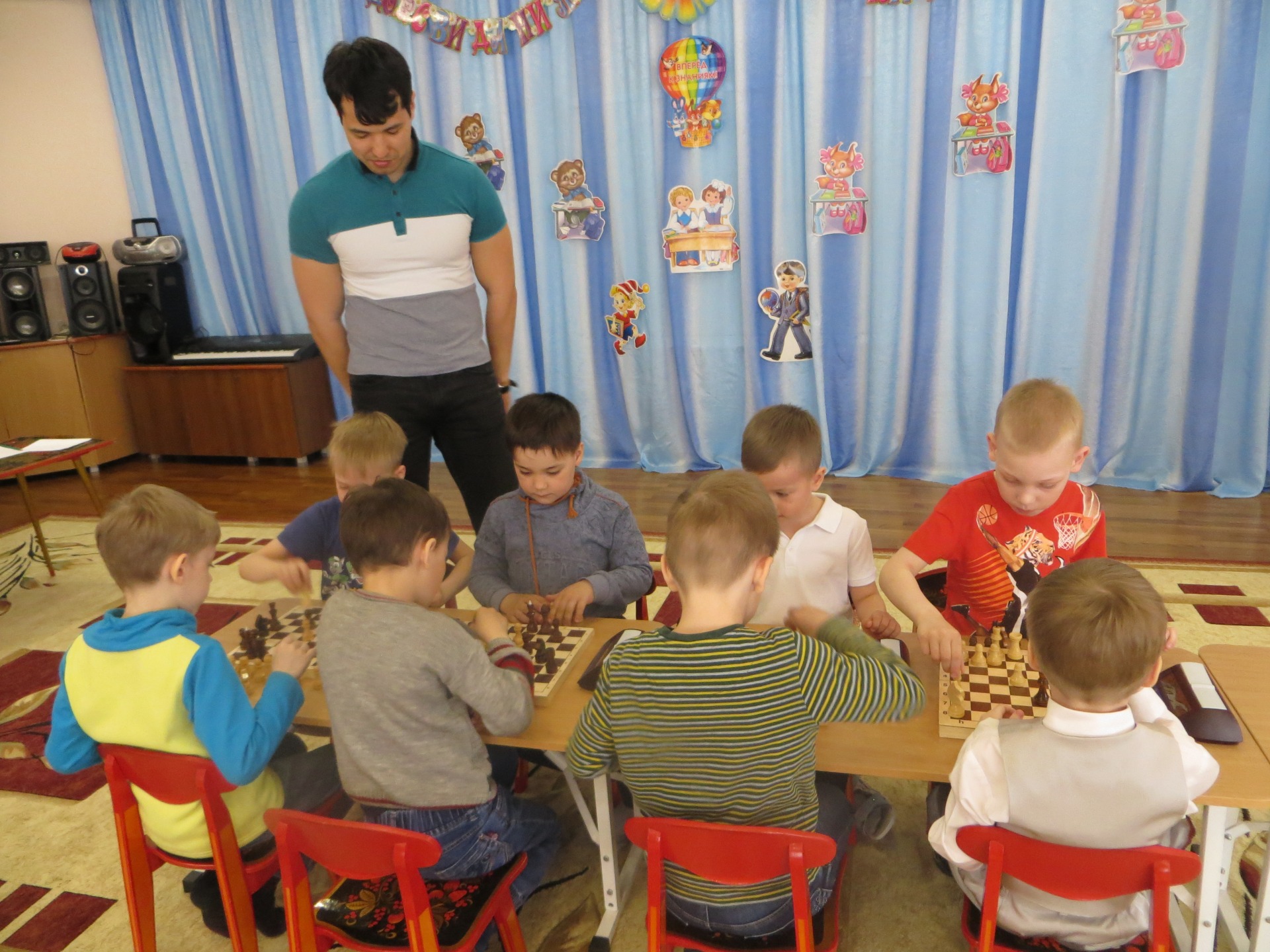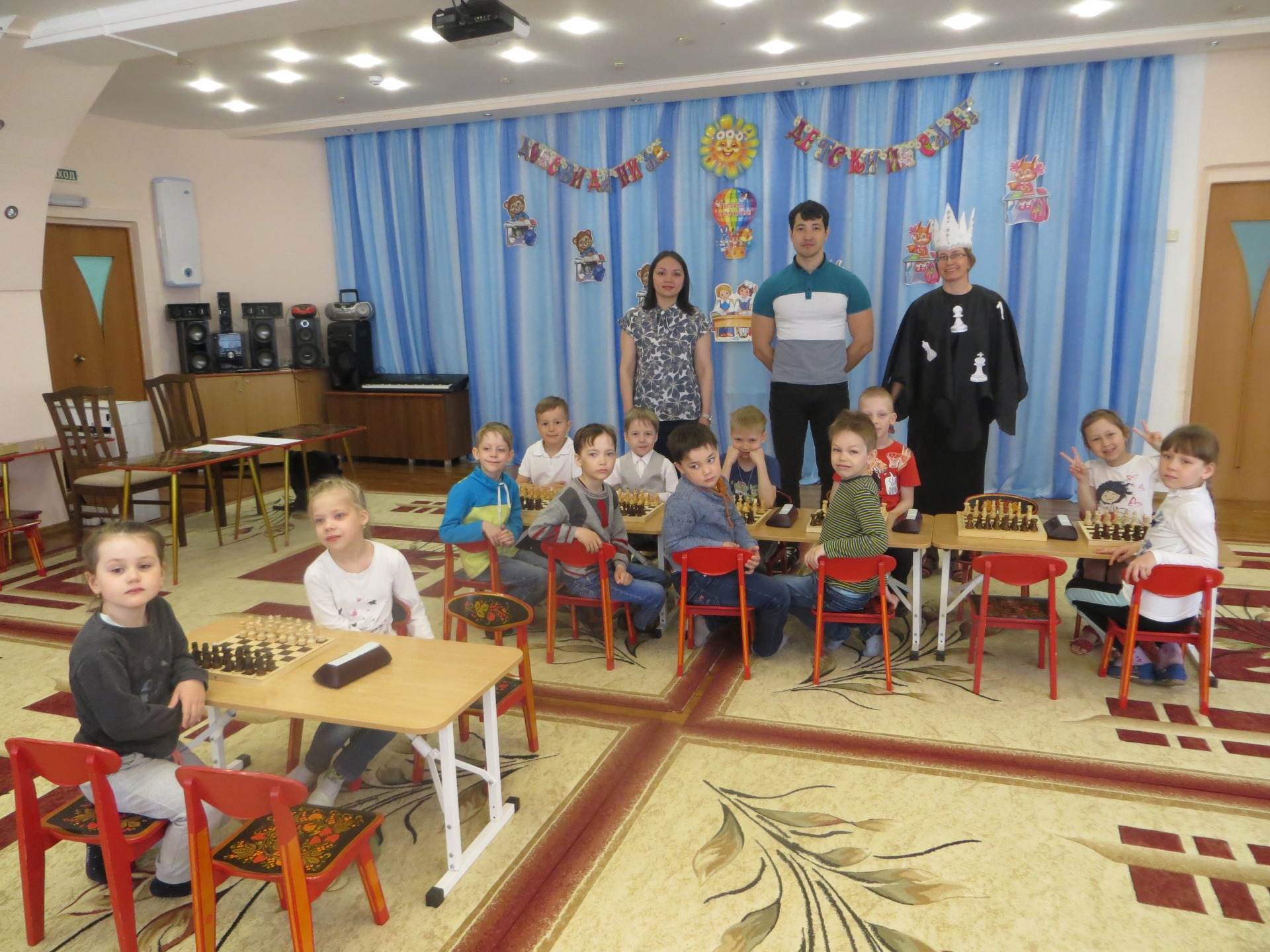 Шахматы - это интеллектуальная игра. Она полезна всем детям, так как у них активно происходят мыслительные процессы, что способствует развитию интеллекта, улучшается внимание, память, мышление, воображение, целеустремленность. В результате дети становятся более уверенными. Педагог дополнительного образования Каверзина Диана Ринатовна, реализующая программу «Обучение игре в шахматы», завершила год обучения детей игре в шахматы праздничным мероприятием «Шахматный турнир». В игре участвовали дети подготовительных групп. В гости к участникам пришла шахматная королева. Она торжественно открыла данное мероприятие. Для судейства был приглашен старший тренер-преподаватель МАУ ДЮСШ № 1 Вахитов Рашид Мулланурович.