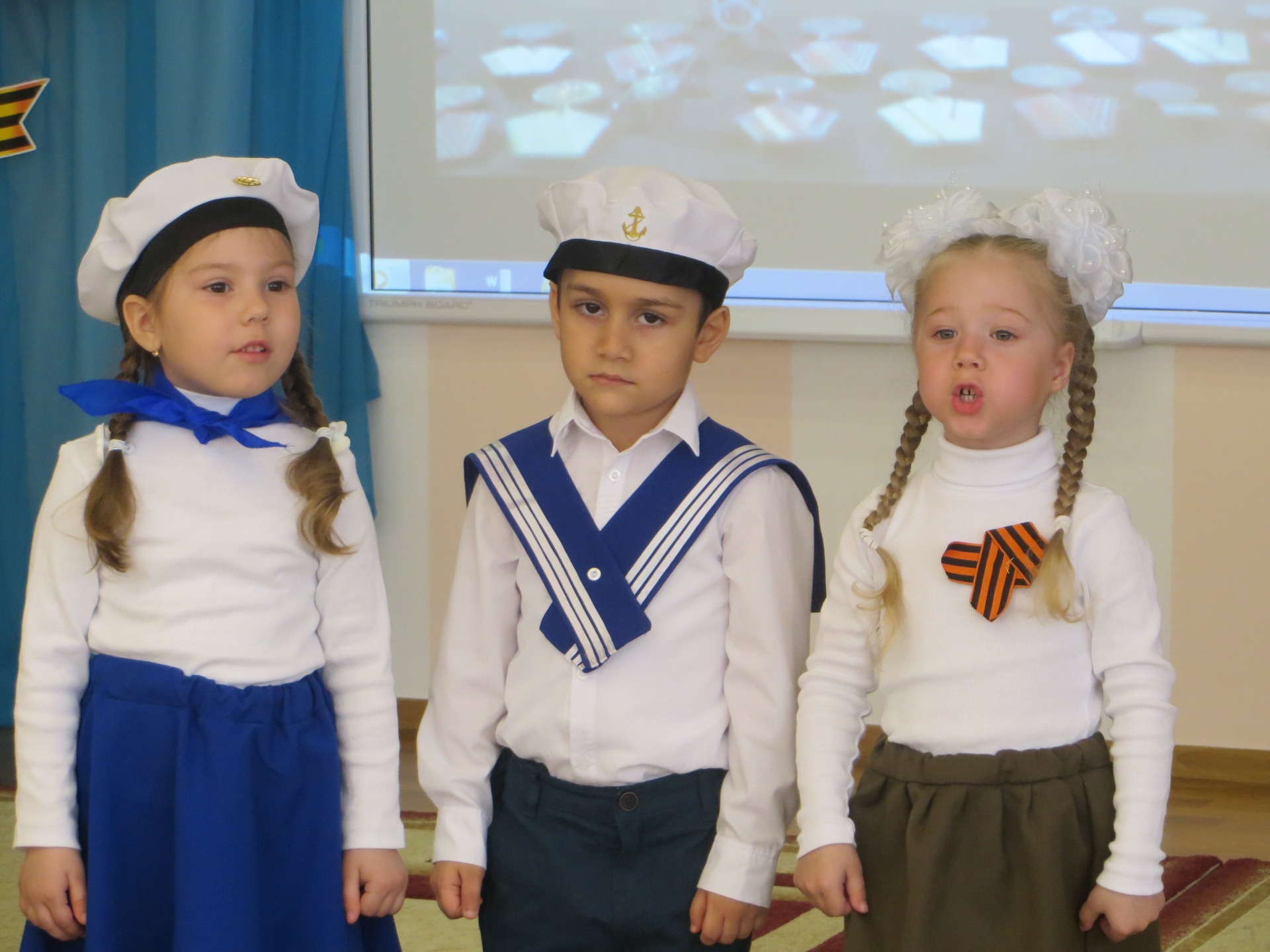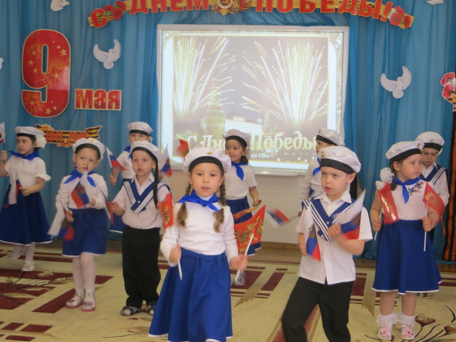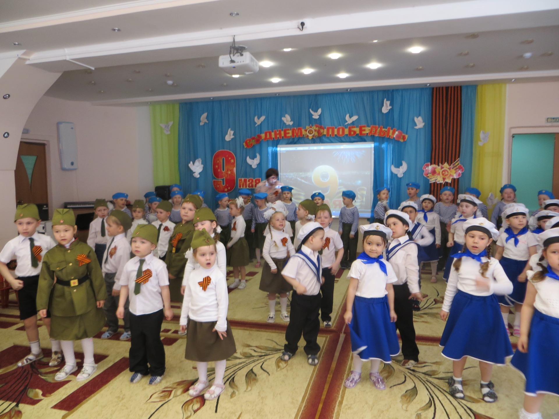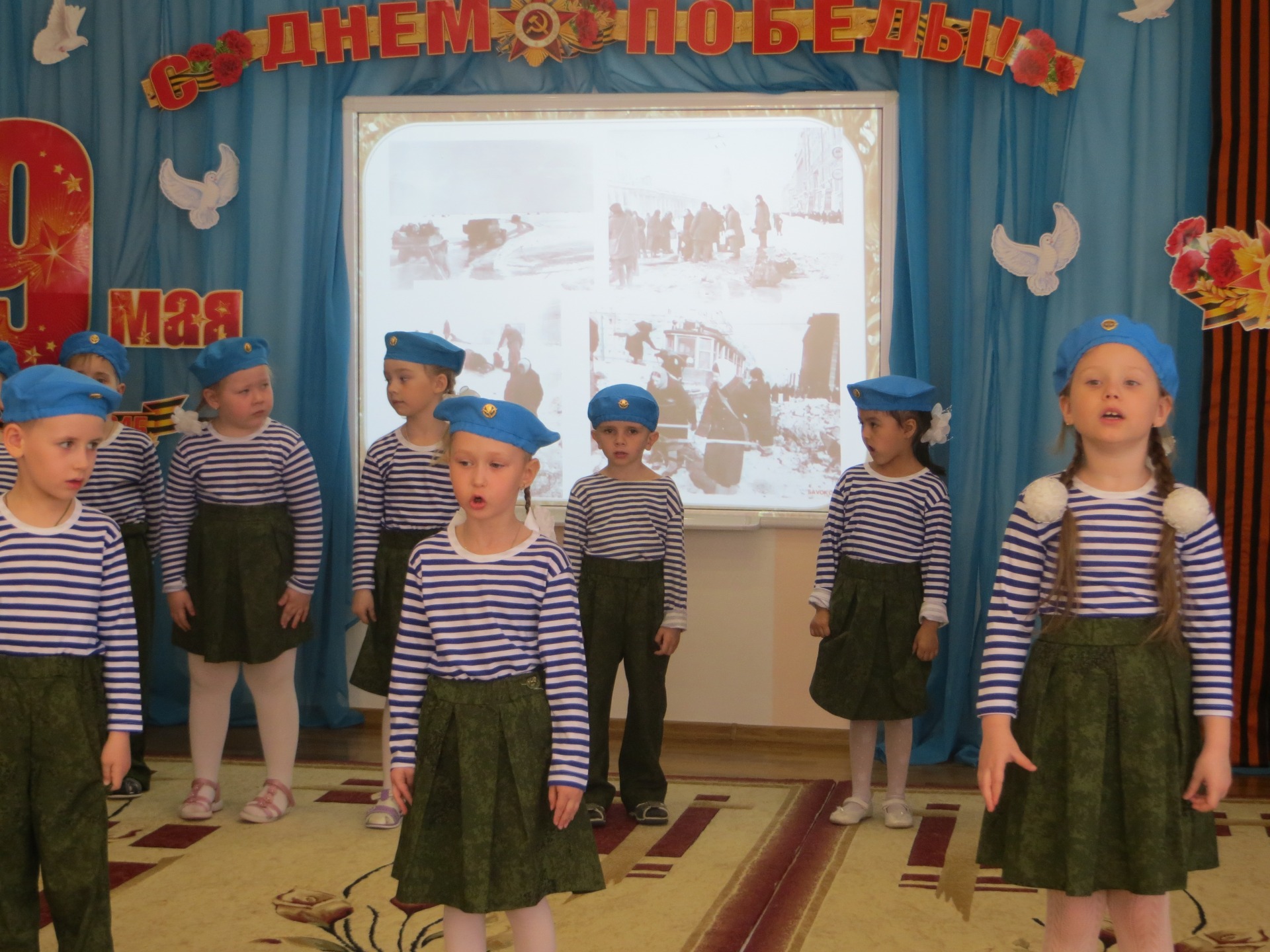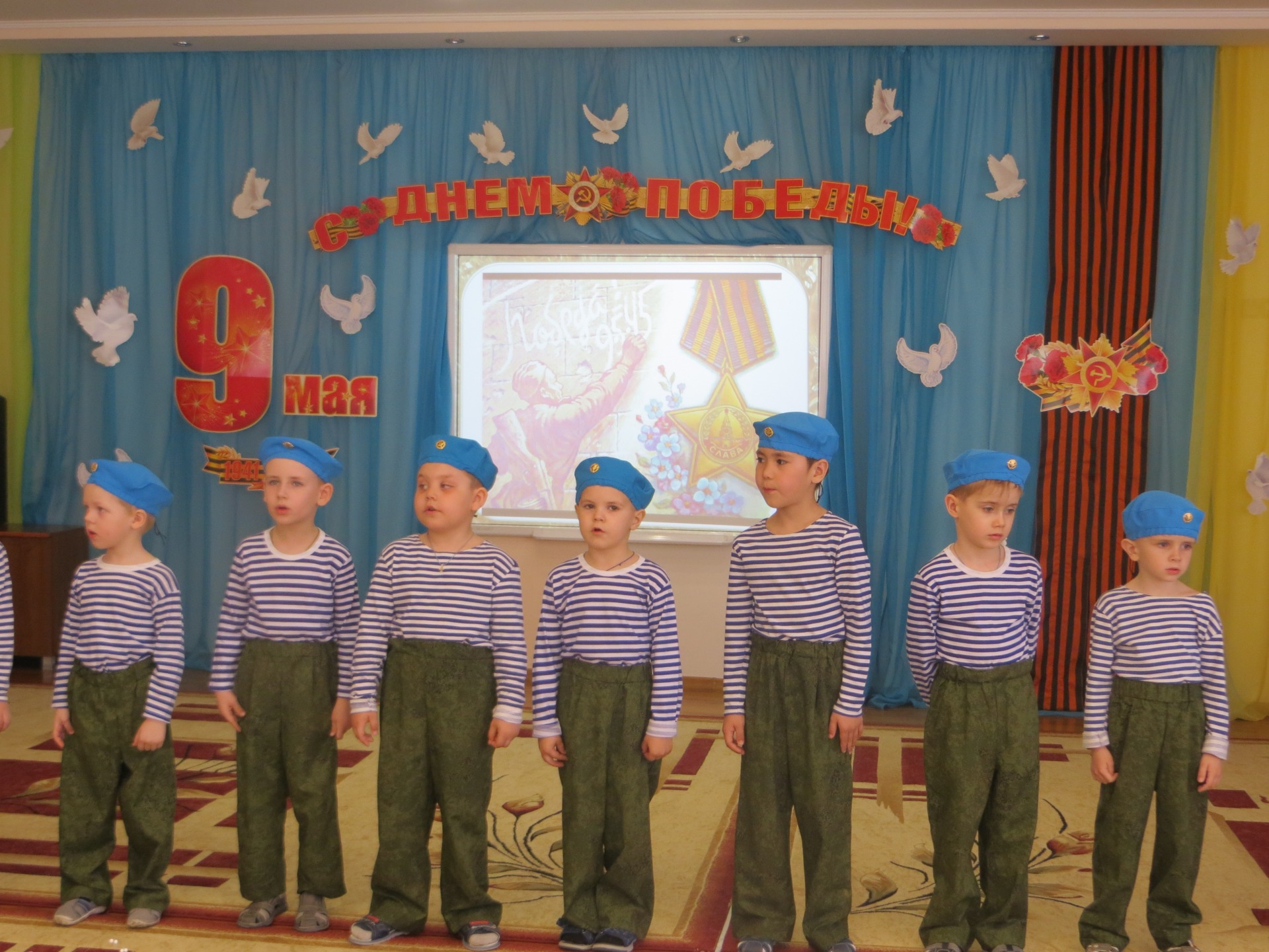 Ежегодно в детском саду проходит смотр строя и песни, где воспитанники с высоко поднятыми головками в формах разных родов войск показывают в игре мастерство в силе, ловкости, и умении петь строевые песни. В этом году мероприятие прошло в другом формате, но с сохранением самого главного – воспитание чувства гордости за свою страну, за счастливое детство. Дети в течение праздника играли в спортивные игры, читали стихи, пели песни военной тематики, просматривали видеофильмы о торжестве победы.