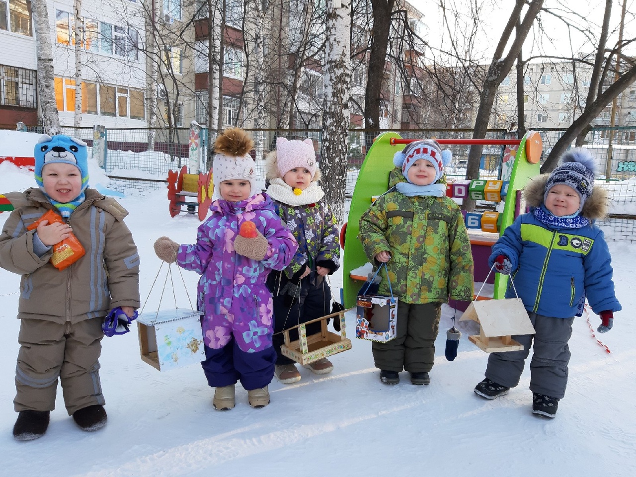 Реализация тематической недели «Наши добрые дела» во второй младшей группе № 7 «Колокольчик» завершилась акцией «Всех птиц на свете – охраняют дети». Ребята дома вместе со своими родителями сделали из разного материала кормушки, которые развесили на деревьях нашей игровой площадки. К изготовлению кормушек родители подошли творчески и, по возможности, в изготовлении им помогали дети. Всем хотелось, чтобы их поделка была: