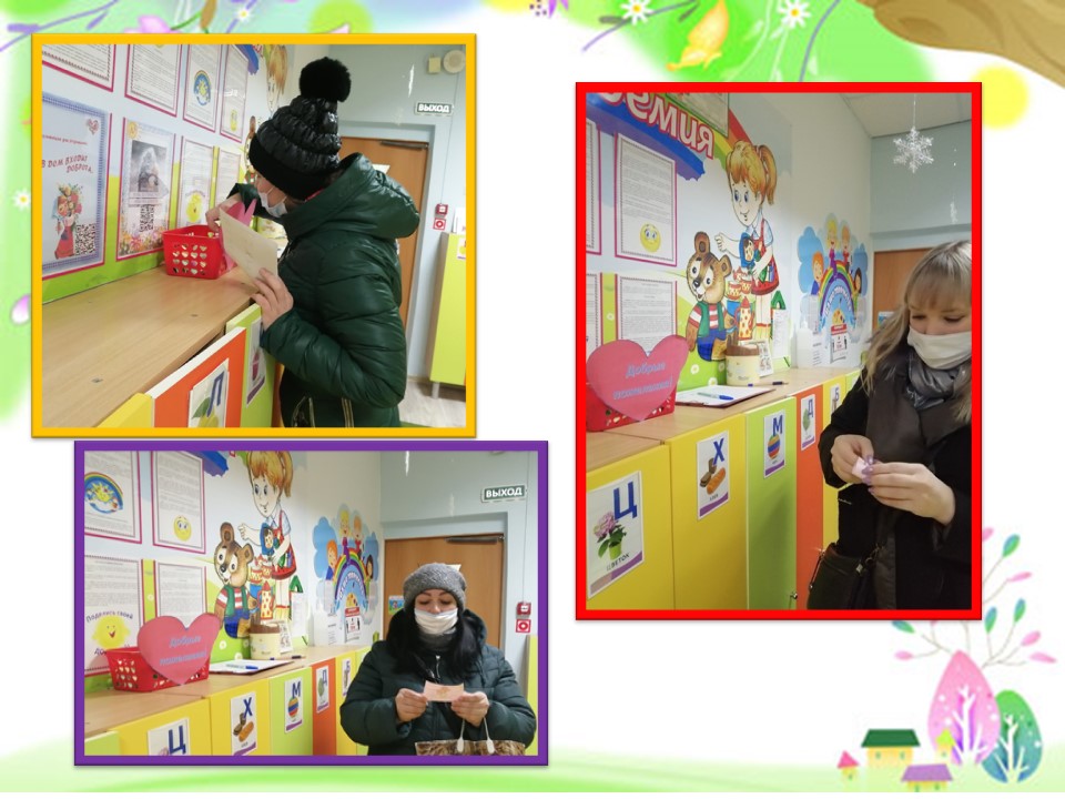 Для проведения акции мы приготовили корзиночку с разными добрыми пожеланиями: хорошего настроения, улыбок от окружающих людей, удачи в делах, и заполнили ими корзинку, которую поставили в приёмной группы. Дети предлагали родителям достать из корзины свиток с позитивным пожеланием на день, но они по - разному реагировали на предложения детей и педагога взять пожелание: кто-то с недоумением, кто- то с интересом, но достав и прочитав наши пожелания – все уходили с улыбкой. Много слов благодарности услышали педагоги от родителей о привитии детям норм нравственности, и уходя проговаривали некоторые из них «Доброта спасет мир!» и улыбались.