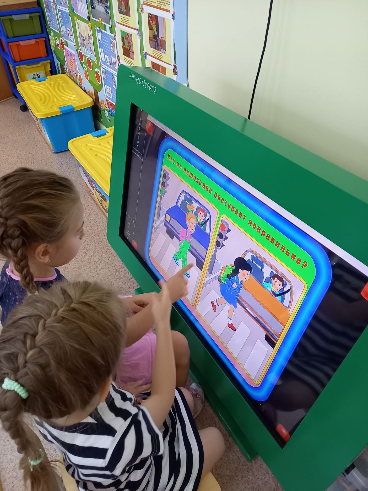 Для изучения темы «Азбука безопасности на дороге» детям предлагались игры дидактические, подвижные, а также разнообразие игр на интерактивном столе. В творческих работах дети старались отразить свои знания о ПДД.