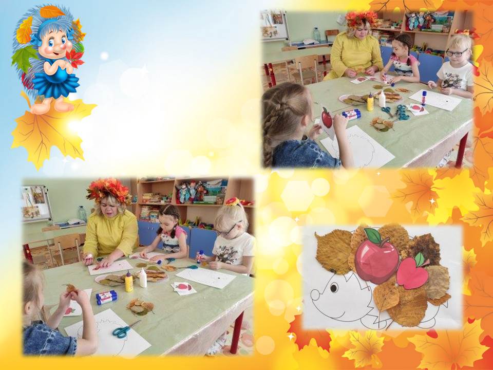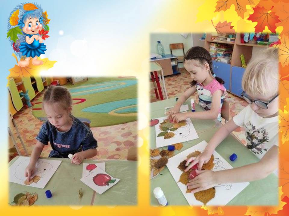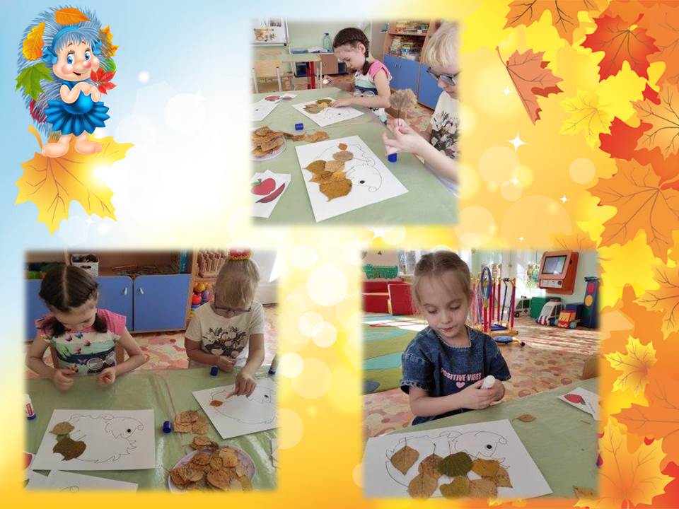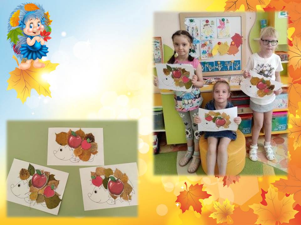 В конце занятия дети выполнили аппликацию «Угощение для ёжика», с использованием природного материала.