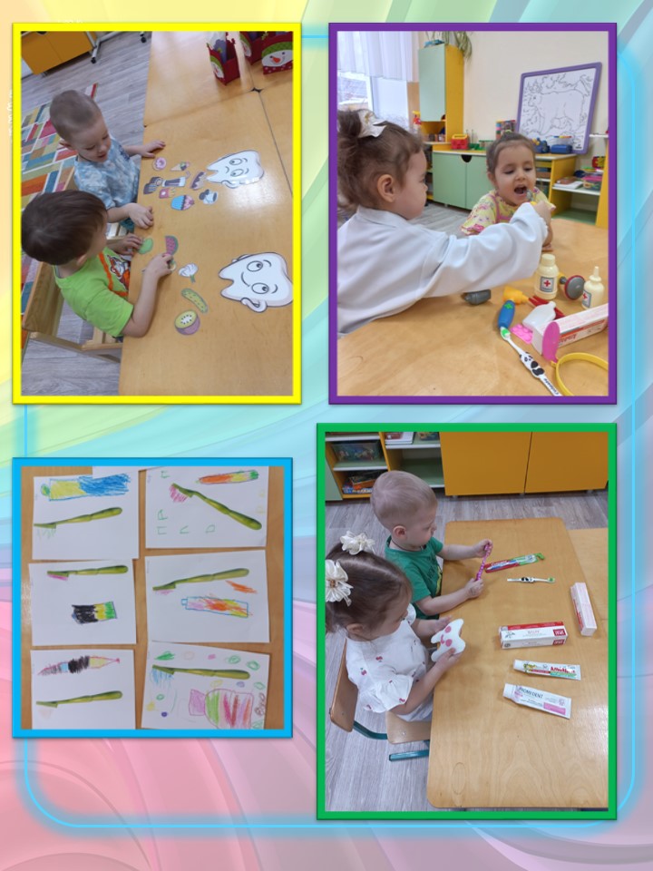 Затем малыши сделали аппликацию с элементами рисования «Наши помощники - зубная щетка и паста» и посмотрели мультфильм «Здоровые зубки и злой Кариес».