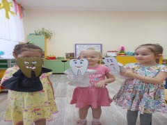 К детям приходили гости: Зубки Веселый и Грустный и злой Кариес. Герои рассказали детям, как правильно ухаживать за зубами, какая пища для них вредная, а какая наоборот способствует укреплению зубов. Ребята вместе с героями играли в сюжетно-ролевую игру «Больница - кабинет стоматолога», в дидактическую игру «Что для зуба хорошо».