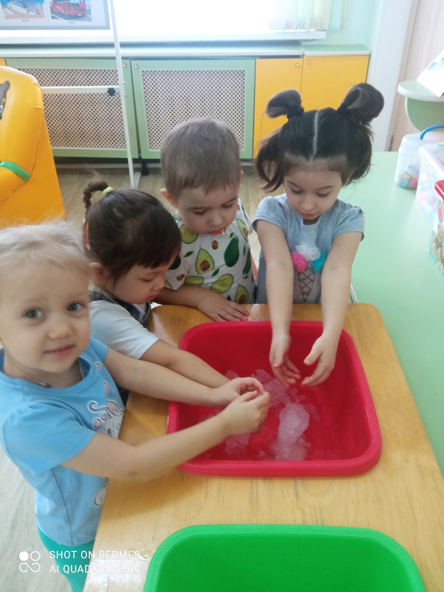 Для того, чтобы уточнить и расширить представления детей о снеге и льде, помочь детям понять изменения их свойств, я детей пригласила подойти к опытно-экспериментальному столу и на ощупь исследовать кусочки льда. Ребята брали в свои ладошки лед и называли его свойства вместе с воспитателем. Он мокрый, холодный, скользкий. Если по нему ударить молотком, он расколется, поэтому он хрупкий. Потом мы с детьми опустили лед в теплую воду и лед стал быстро таять. Я объяснила детям, что лед – это вода в твердом состоянии.