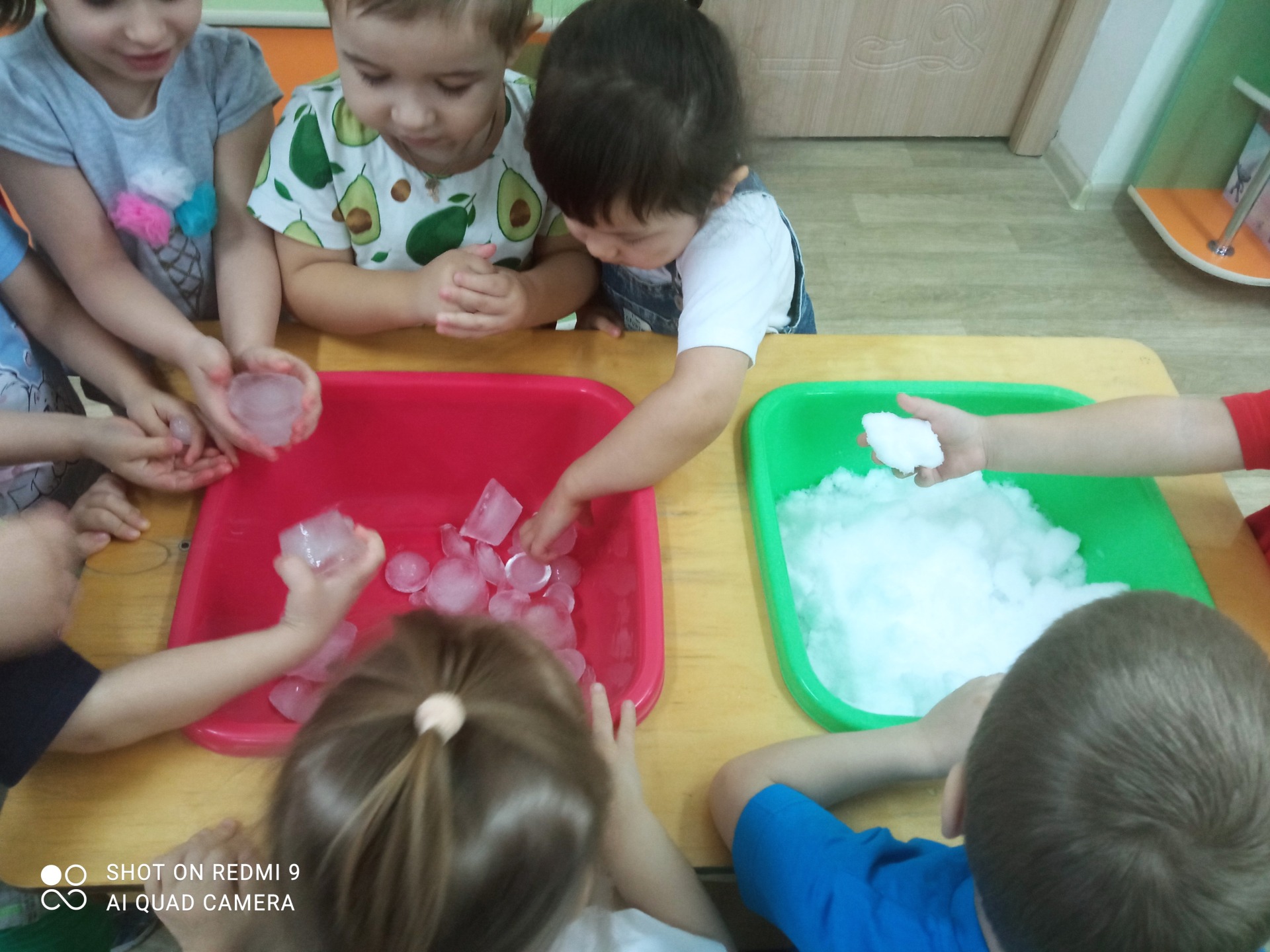 Следующий эксперимент дети провели со снегом. Дети пробовали его на ощупь и сравнивали его со льдом. Вместе с детьми мы назвали отличия: снег мягкий, а лед твердый; снег белый, а лед прозрачный; снег легкий, а лед тяжелый. Когда дети опускали снег в теплую воду он сразу таял.