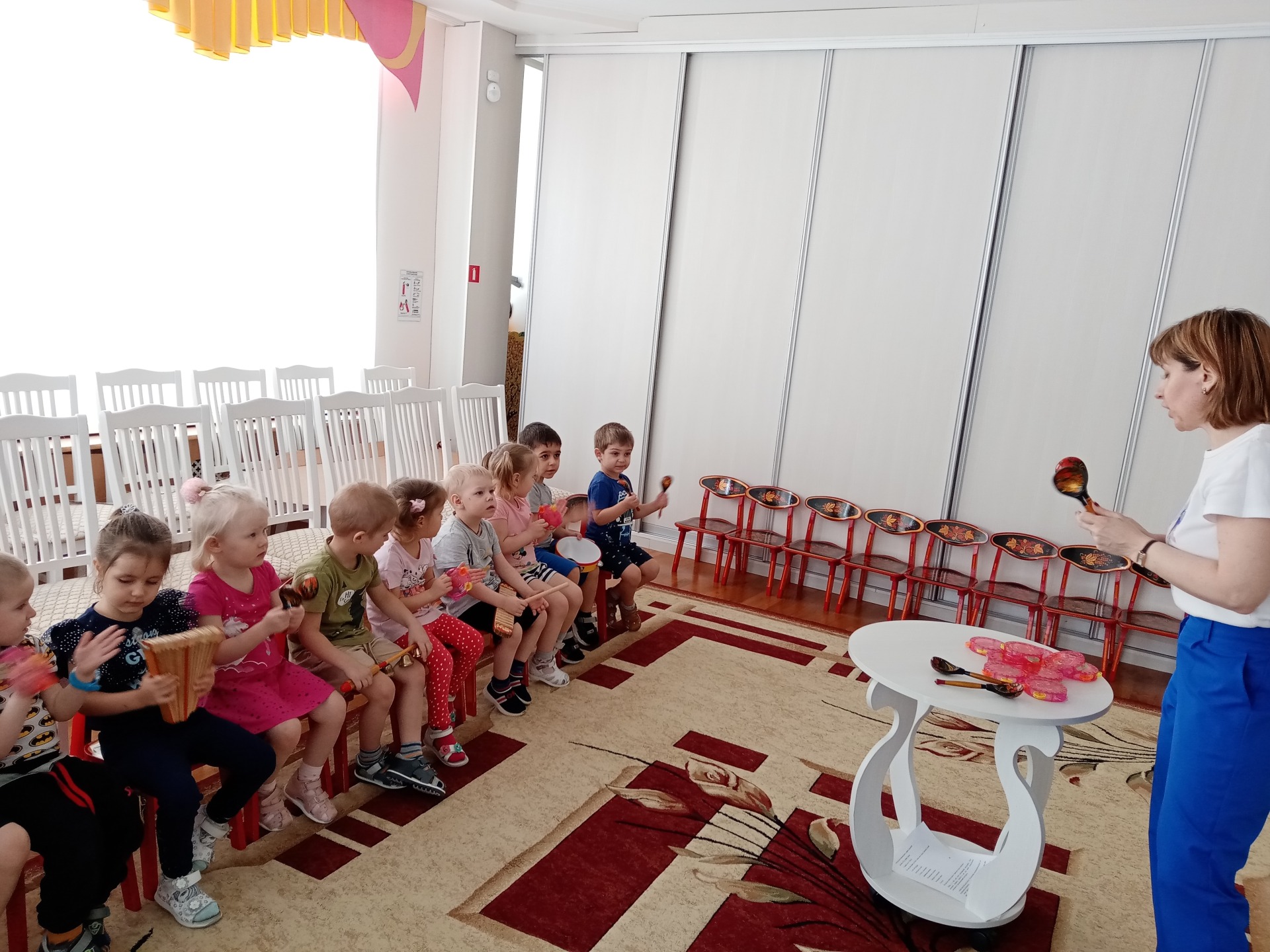 Войдя в музыкальный зал, ребята второй младшей группы поприветствовали друг руга песенкой «Здравствуйте ладошки». Музыкальный руководитель предложила детям отправиться в путешествие в город музыкальных инструментов. Отправились дети на «автобусе» под веселую песенку. Приехав в город, они услышали народную песню «Ах, вы сени» в исполнении оркестра народных инструментов. Отгадав загадки познакомились с народными, музыкальными инструментами. Посмотрели на мультимедиа какие они бывают. Каждый ребенок взял в руки музыкальные инструменты и все вместе сыграли шумовой оркестр. В детский сад ребята вернулись на музыкальном «автобусе».