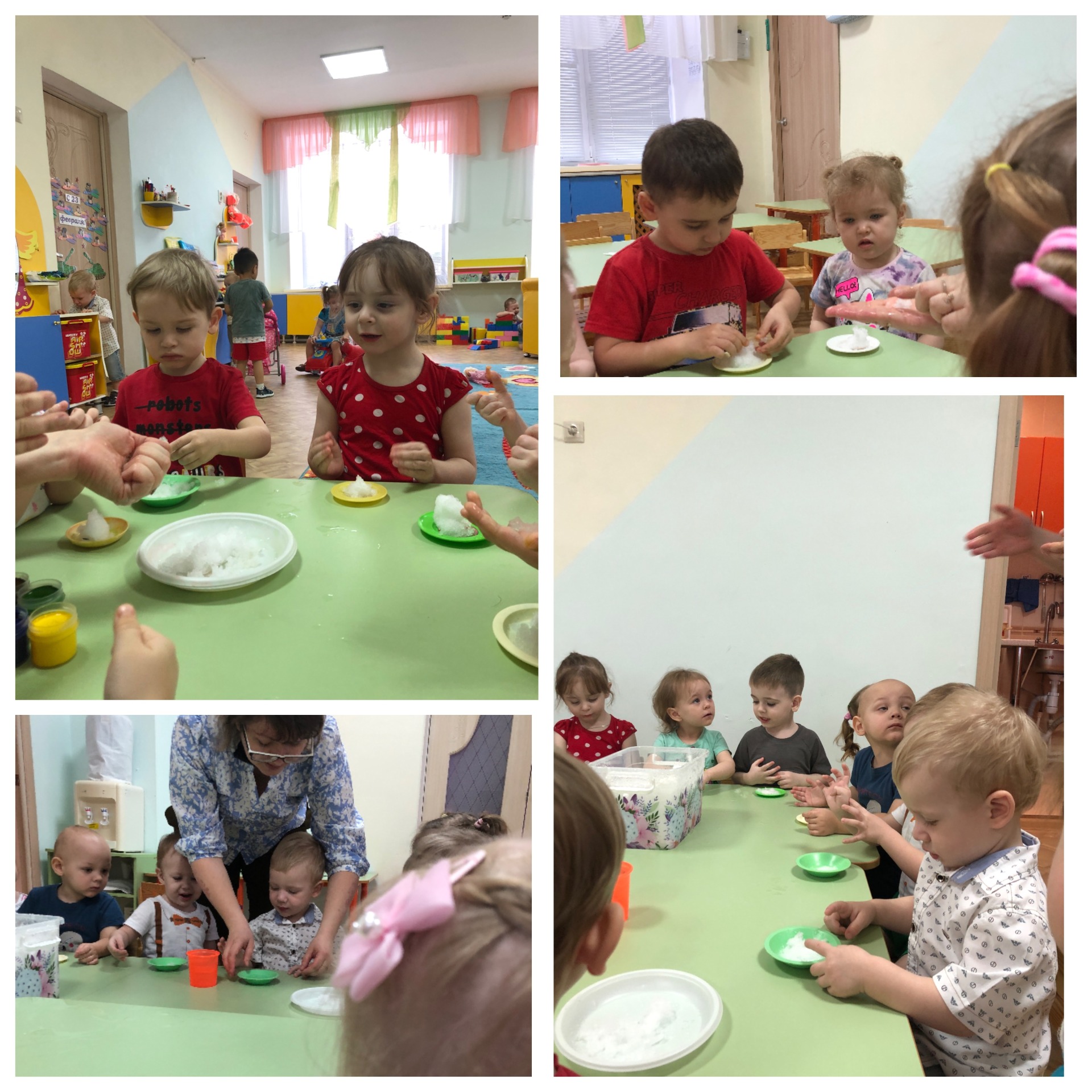 В ходе краткосрочного проекта «Весенний снег», мы узнали, что он холодный, в тепле снег тает и превращается в водичку. Каждый малыш взял на ладошку небольшую горсть снега и от тепла ладони, снег начал таять, образовалась водичка – ладонь стала мокрая. В следующем эксперименте, когда снег растаял, мы увидели, что вода стала грязной. И в завершающем эксперименте, мы раскрасили снег разноцветной краской. Увидели, что снег рыхлый и активно впитывает в себя краску. И как только снег растаял – водичка стала разноцветной, получились очень забавные цвета. Благодаря таким простым экспериментам, мы закрепили знания детей о своём здоровье, безопасности и обогатили фантазию наших детей.