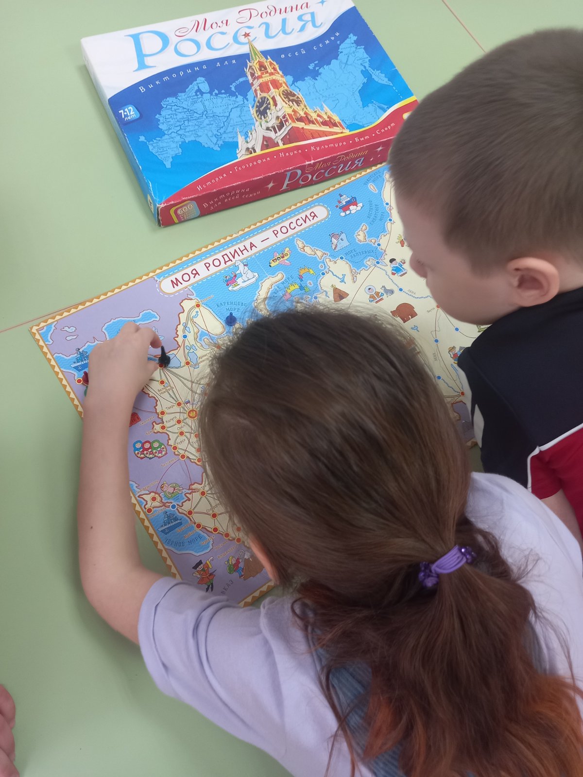 В подготовительной группе «Солнышко» в центре патриотического воспитания большое количество разнообразного дидактического материала, которым последнее время заинтересовались наши ребята. Самой любимой у них считается настольная игра-ходилка «Моя Родина - Россия», в которую они готовы играть и утром, и вечером. С помощью данной игры закрепляем с детьми знания о достопримечательностях как города Тобольска, Тюменской области, так и России в целом. Детям очень нравится рассуждать о разнообразии растительности, животных леса; народах, населяющих нашу многогранную территорию, их традициях. Вот с этого и начинается Родина: с желания познавать, а в дальнейшем, поддерживать и уважать, ценить то, что создано другими, способствовать развитию ценностей.