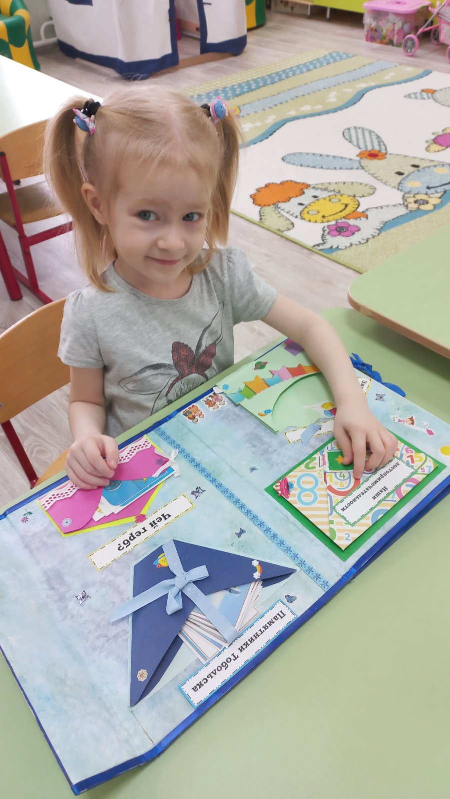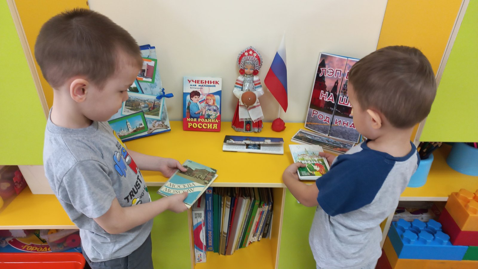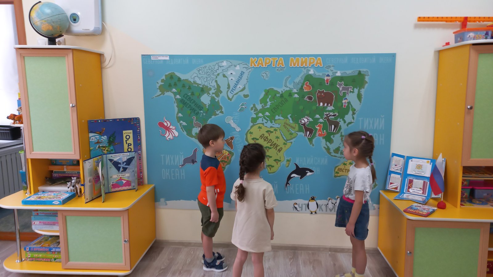 Воспитанники средней группы № 4 «Лебедушка» с данными категориями знакомятся на занятиях, в игре и в быту. Для этого создан центр познавательного развития, где имеются книги, альбомы, иллюстрации, дидактические игры, лэпбуки по нравственно-патриотическому воспитанию. И самое привлекательное место - это магнитная карта мира, на которой дети размещают разнообразные значки - обозначения: рыб, животных, народы, населяющие нашу планету. Во время образовательной деятельности дети путешествуют по разным странам, заселяют моря и океаны рыбой, а материки – народами, которые живут в разных частях земли. На познавательных занятиях-путешествиях на тему: «Мой любимый город Тобольск», «Моя Родина - Россия» познакомились с тем, что им близко, закрепили названия городов Тобольск, Москва. Для пополнения знаний о родном крае рассматриваем альбомы и лэпбуки на тему: «Моя Тюменская область», «Растительный и животный мир Тюменской области», «Традиции народ, населяющих Тюменскую область» иллюстрации о родном городе.