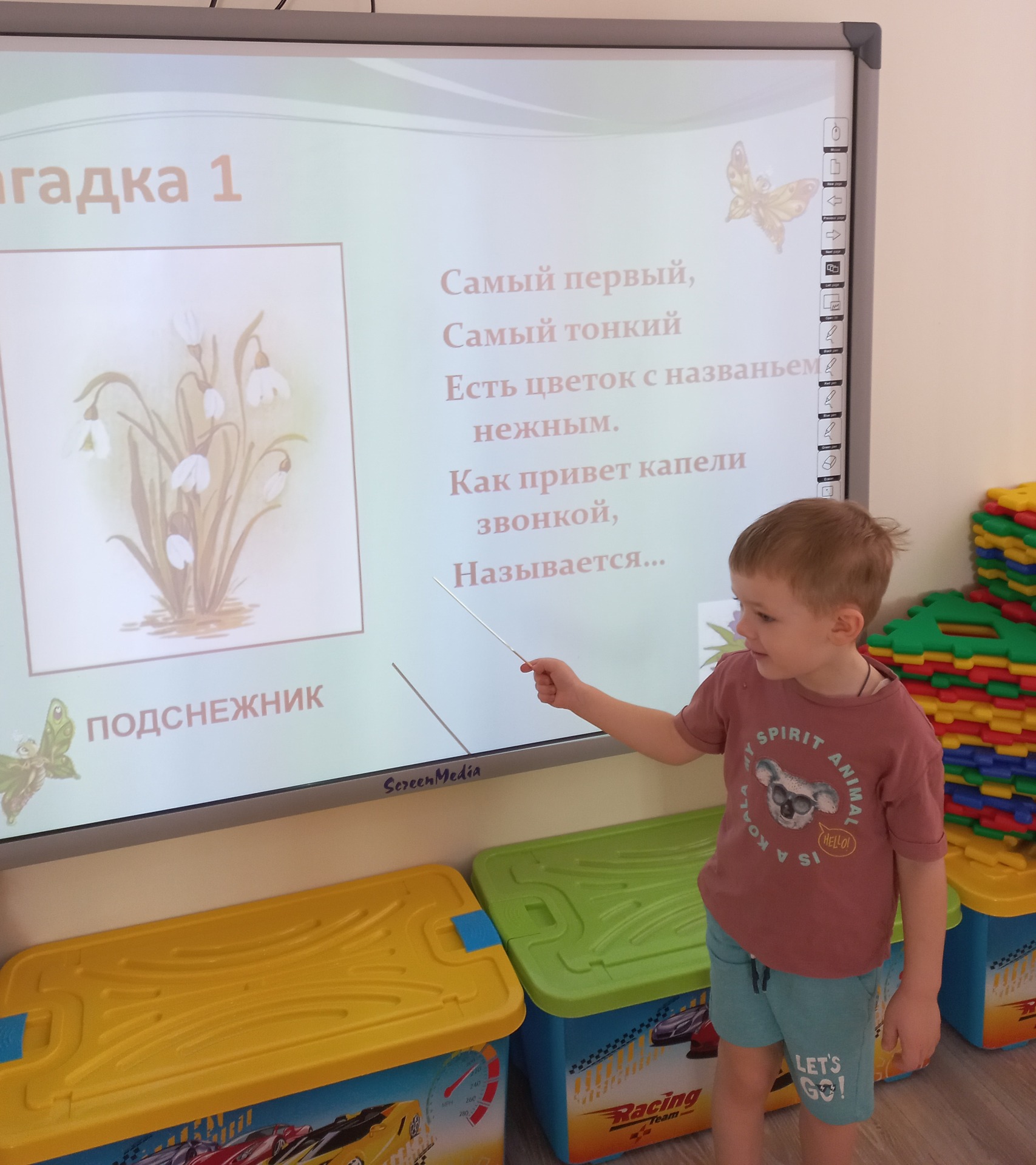 В этот день с детьми была проведена виртуальная экскурсия по весеннему лесу, в ходе которой они познакомились с природой родного края. Остановившись на лесной полянке, дети увидели цветок-подснежник. Цветок поиграл с детьми в игры: «Найди цветок», «Цветочные загадки».