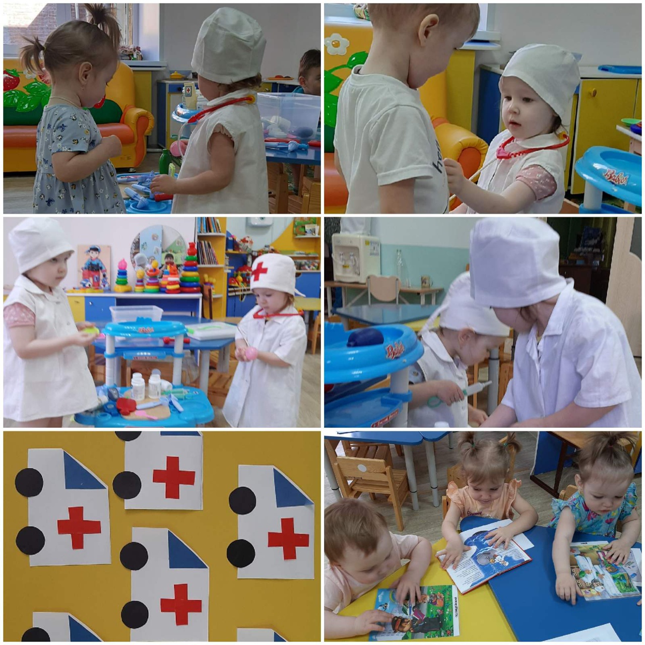 В первой младшей группе «Ягодка» формировали представления детей о труде взрослых, а именно о профессии врача. Прочитали К. Чуковского «Айболит» и узнали, что он тоже врач и ответили на вопросы: Во что одет? (белый халат и шапочка); Что делает? (лечит); Какие инструменты у него есть? (градусник, шприц, скребок). В ходе дидактической игры «Кому что нужно» развивали внимание и мышление. Создали условия для сюжетно-ролевой игры «Больница», рассматривали книги, картинки, иллюстрации. Делали аппликацию « Скорая помощь для доктора Айболита» закрепили приемы аппликации, учились работать аккуратно.