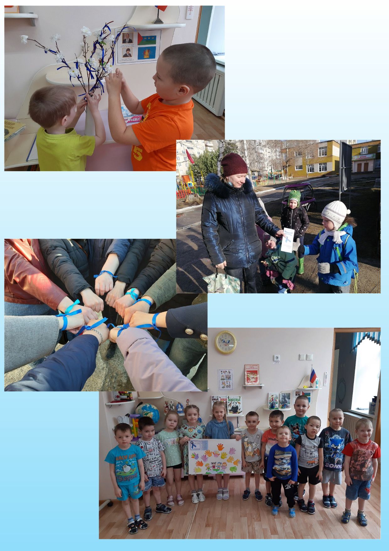 С 19 - 30 апреля по традиции в детском саду проведены мероприятия в рамках акции «Синяя лента апреля - символ борьбы с жестоким обращением над детьми» с целью привлечения внимания общественности к значимости ценности жизни, к проблемам домашнего насилия; формирования в обществе культуры семейных отношений, основанных на партнерстве и отрицании насильственных способов общения.