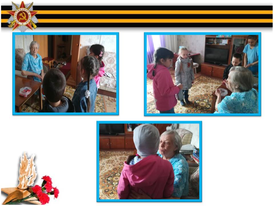 В преддверии празднования Дня Победы воспитанники подготовительных групп 1,9,8,5 вместе со своими воспитателями побывали в гостях у ветеранов Великой Отечественной войны Павла Перфильевича Велижанина и Галины Степановны Федоровой, где поздравили с наступающим праздником 9 мая. Дети читали стихи, пели песни военных лет, дарили цветы, открытки сделанные своими руками, говорили слова благодарности. Ветераны радуются, когда понимают, что современные дети знают о том, что сделали деды для Победы. Низкий поклон, кто подарил нам мирное небо над головой. Мы все благодарим тех, кто сражался за Родину и будущее своих потомков!