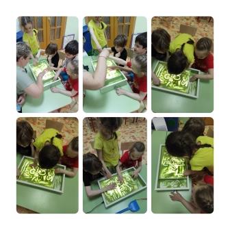 Играли в световой мини – песочнице, где с удовольствием рисовали двумя пальчиками одновременно, развивая работу двух полушарий. Подсветка «оживляла» картинку, создавала волшебную атмосферу. Им было весело и интересно. Вот, что из этого получилось.