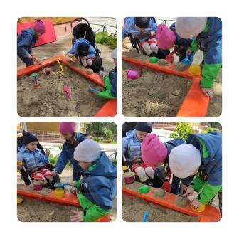 Дети так увлеклись игрой с песком на прогулке, что продолжили воплощать свои идеи и фантазии в группе, используя кинетический песок, где наблюдали, как песок вытекает из ладошки словно ручеек, оставляли отпечатки различных фигур, потом угадывали, называли и находили в группе.